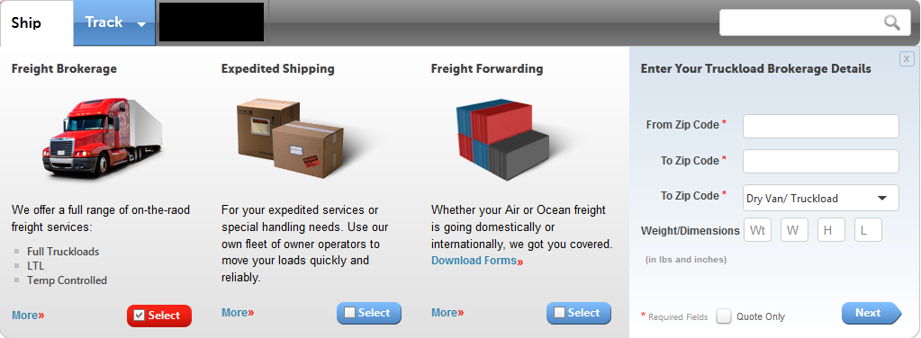 <telerik:RadMenu ID="SubNav" runat="server" ClickToOpen="true" Width="800px" EnableEmbeddedBaseStylesheet="false" EnableEmbeddedSkins="false" CollapseAnimation-Type="None" ExpandAnimation-Type="None"> <Items> <telerik:RadMenuItem Text="Ship" PostBack="false" OuterCssClass="menuButton menuButtonShip"> <Items> <telerik:RadMenuItem CssClass="subNavPopUpBox"> <ItemTemplate> <div id="shipMenu"> <div id="truckload" class="subNavColumns"> <div class="subNavColumnBody"> <h2> Freight Brokerage</h2> <div class="subNavImages"> <img src="/Sitefinity/WebsiteTemplates/Template2012/App_Themes/CorporateTheme/Images/subNavTruckload.png" height="98px" width="139px" /></div> <p> We offer a full range of on-the-raod freight services: <ul> <li><strong>Full Truckloads</strong></li> <li><strong>LTL</strong></li> <li><strong>Temp Controlled</strong></li> </ul> </p> </div> <div class="subNavColumnFooter"> <a href="/about/our-services/freight-brokerage" class="subNavLink subNavMoreLink"> more</a><a id="shipSelectTruckload" href="#" class="subNavSelect subNavSelectOn">select</a> </div> </div> <div id="expedited" class="subNavColumns"> <div class="subNavColumnBody"> <h2> Expedited Shipping</h2> <div class="subNavImages"> <img src="/Sitefinity/WebsiteTemplates/Template2012/App_Themes/CorporateTheme/Images/subNavExpedited.png" /></div> <p> For your expedited services or special handling needs. Use our own fleet of owner operators to move your loads quickly and reliably.</p> </div> <div class="subNavColumnFooter"> <a href="/about/our-services/expedited-shipping" class="subNavLink subNavMoreLink"> more</a><a id="shipSelectExpedited" href="" class="subNavSelect subNavSelectOff">select</a></div> </div> <div id="freight" class="subNavColumns"> <div class="subNavColumnBody"> <h2> Freight Forwarding</h2> <div class="subNavImages"> <img src="/Sitefinity/WebsiteTemplates/Template2012/App_Themes/CorporateTheme/Images/subNavFreight.png" /></div> <p> Whether your Air or Ocean freight is going domestically or internationally, we got you covered.<br /> <a href="" class="subNavLink subNavDownloadLink">Download Forms</a> </p> </div> <div class="subNavColumnFooter"> <a href="/about/our-services/freight-forwarding" class="subNavLink subNavMoreLink"> more</a><a id="shipSelectFreight" href="" class="subNavSelect subNavSelectOff">select</a></div> </div> <div id="shipForm" class="subNavColumns"> <fieldset id="shipFormTruckload" class="form"> <div class="subNavColumnBody"> <h2> Enter Your Truckload Brokerage Details</h2> <ul> <li> <asp:Label ID="FromZipCodeLabel" AssociatedControlID="FromZipCode" runat="server">From Zip Code <span class="validate">*</span></asp:Label> <telerik:RadTextBox Width="168px" runat="server" ID="FromZipCode" EnableEmbeddedBaseStylesheet="false" EnableEmbeddedSkins="false" EnableSingleInputRendering="true"> </telerik:RadTextBox> </li> <li> <asp:Label ID="ToZipCodeLabel" AssociatedControlID="ToZipCode" runat="server"> To Zip Code <span class="validate">*</span></asp:Label> <telerik:RadTextBox Width="168px" runat="server" ID="ToZipCode" EnableEmbeddedBaseStylesheet="false" EnableEmbeddedSkins="false" EnableSingleInputRendering="true"> </telerik:RadTextBox> </li> <li> <asp:Label ID="TruckTypesLabel" AssociatedControlID="TruckTypes" runat="server"> To Zip Code <span class="validate">*</span></asp:Label> <telerik:RadComboBox Width="168px" ZIndex="99999" ID="TruckTypes" runat="server" Height="50px" EnableEmbeddedBaseStylesheet="false" EnableEmbeddedSkins="false"> <Items> <telerik:RadComboBoxItem Text="Dry Van/ Truckload" /> <telerik:RadComboBoxItem Text="Flatbed" /> <telerik:RadComboBoxItem Text="Temperature Controlled" /> <telerik:RadComboBoxItem Text="Over Dimensional" /> <telerik:RadComboBoxItem Text="LTL" /> </Items> </telerik:RadComboBox> </li> <li> <asp:Label ID="DimensionsLabel" AssociatedControlID="Weight" runat="server"> Weight/Dimensions<br /> <span class="subtleNote">(in lbs and inches)</span></asp:Label> <div style="position: relative; float: right; width: 182px"> <telerik:RadTextBox ID="Weight" EmptyMessage="Wt" runat="server" Width="25px" EnableEmbeddedBaseStylesheet="false" EnableEmbeddedSkins="false" EnableSingleInputRendering="true"> </telerik:RadTextBox> <telerik:RadTextBox ID="Width" EmptyMessage="W" runat="server" Width="25px" EnableEmbeddedBaseStylesheet="false" EnableEmbeddedSkins="false" EnableSingleInputRendering="true"> </telerik:RadTextBox> <telerik:RadTextBox ID="Height" EmptyMessage="H" runat="server" Width="25px" EnableEmbeddedBaseStylesheet="false" EnableEmbeddedSkins="false" EnableSingleInputRendering="true"> </telerik:RadTextBox> <telerik:RadTextBox ID="Length" EmptyMessage="L" runat="server" Width="25px" EnableEmbeddedBaseStylesheet="false" EnableEmbeddedSkins="false" EnableSingleInputRendering="true"> <EmptyMessageStyle Height="20px" /> </telerik:RadTextBox> </div> </li> </ul> </div> <div class="subNavColumnFooter"> <span class="validate">*</span> <span class="subtleNote">Required Fields</span> <telerik:RadButton Height="27px" ID="TruckloadQuoteOnly" Text="Quote Only" TabIndex="8" runat="server" ToggleType="CheckBox" ButtonType="LinkButton" AutoPostBack="false" EnableEmbeddedBaseStylesheet="false" EnableEmbeddedSkins="false"> <ToggleStates> <telerik:RadButtonToggleState PrimaryIconCssClass="rbToggleCheckboxChecked" /> <telerik:RadButtonToggleState PrimaryIconCssClass="rbToggleCheckbox" /> </ToggleStates> </telerik:RadButton> <a href="" class="subNavNext">Next</a> </div> </fieldset> <fieldset id="shipFormExpedited" class="form"> <div class="subNavColumnBody"> <h2> Enter Your Expedited Shipping Details</h2> <ul> <li> <asp:Label ID="Test1Label" AssociatedControlID="Test1" runat="server">From Zip Code <span class="validate">*</span></asp:Label> <telerik:RadTextBox Width="168px" runat="server" ID="Test1" EnableEmbeddedBaseStylesheet="false" EnableEmbeddedSkins="false"> </telerik:RadTextBox></li> <li> </ul> </div> <div class="subNavColumnFooter"> <a href="" class="subNavNext">Next</a> </div> </