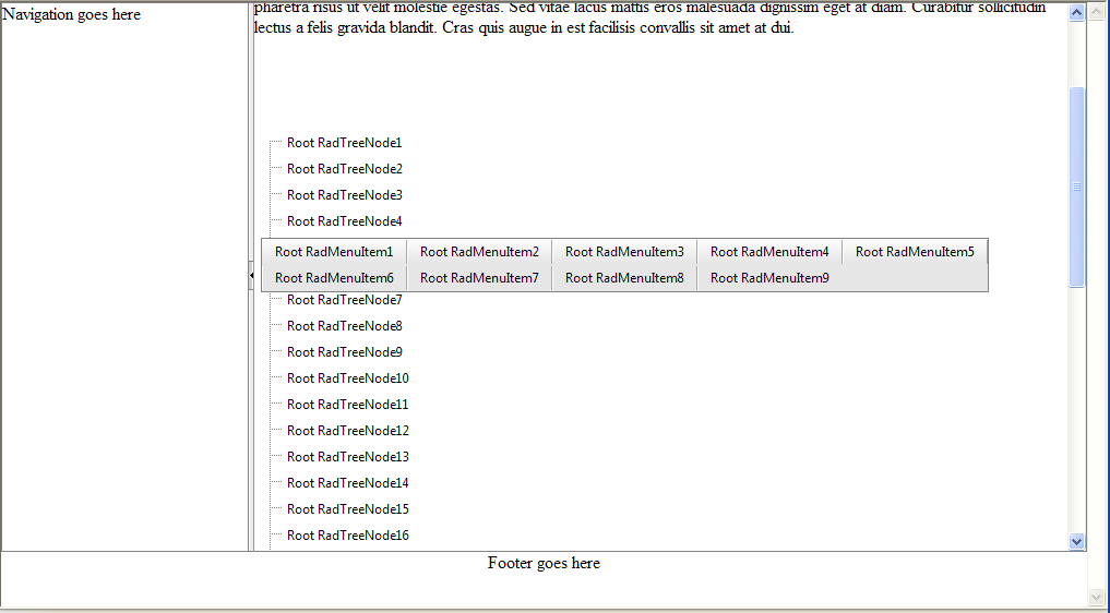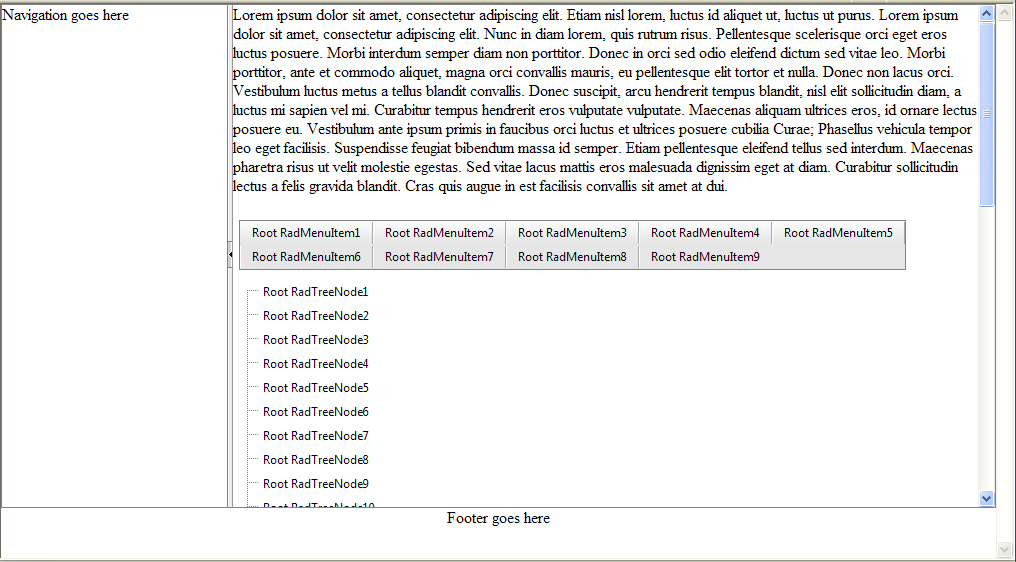 Basically, I have a page that uses RadPanes to split the screen into 3 parts (navigation - left side, main screen - right, footer - across the bottom). Within the main screen I have a table, which contains 2 rows, 1 cell each row. Top cell contains a RadMenu, and the bottom cell contains a RadTreeView.