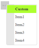 <div style="width: 100px; float: left; padding-top: 5px;"> <telerik:RadImageButton ID="btaction" runat="server" OnClientClicking="showcontextmenu" Image-Url="https://via.placeholder.com/34x34" Height="34px" Width="34px"></telerik:RadImageButton> <telerik:RadContextMenu ID="cmactions" runat="server" EnableRoundedCorners="True" EnableShadows="True" EnableAriaSupport="True" OnItemDataBound="cmactions_ItemDataBound" RenderMode="Auto"> <Items> <telerik:RadMenuItem Text="Item1"></telerik:RadMenuItem> <telerik:RadMenuItem Text="Item2"></telerik:RadMenuItem> <telerik:RadMenuItem Text="Item3"></telerik:RadMenuItem> <telerik:RadMenuItem Text="Item4"></telerik:RadMenuItem> </Items> </telerik:RadContextMenu></div><script> function showcontextmenu(sender, args) { var contextMenu = $find("<%=cmactions.ClientID %>"); var childItem = new Telerik.Web.UI.RadMenuItem(); var displayText = ''; // if we have items in the 'actions menu', then add it to the parent' contextMenu.get_items().insert(0, childItem); // set menu text childItem.set_text("Custom"); // set employeeid identifier childItem.set_value("2123"); // childItem is the client-side object of type RadMenuItem // https://docs.telerik.com/devtools/aspnet-ajax/controls/menu/client-side-programming/overview#getting-the-instance-of-a-particular-radmenuitem var childItemElement = childItem.get_element() $telerik.$(childItem.get_element()).css("background-color", "greenyellow") $telerik.$(childItem.get_element()).find(".rmLink").css("font-weight","bold") contextMenu.show(args.get_domEvent()); args.set_cancel(true); }</script>Please modify the code and screenshot I have provided so that it is more clear what the issue is and what is the difference between the actual and desired appearance.