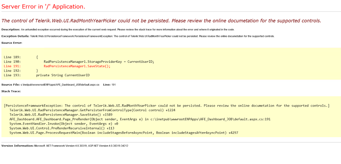 The control of Telerik.Web.UI.RadMonthYearPicker could not be persisted. Please review the online documetation for the supported controlsTelerik.