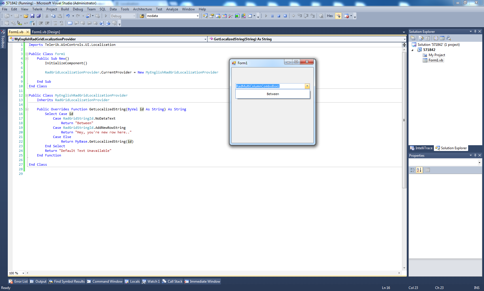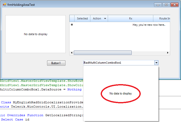 Private Class MyEnglishRadGridLocalizationProvider Inherits Telerik.WinControls.UI.Localization.RadGridLocalizationProvider Public Overrides Function GetLocalizedString(ByVal id As String) As String Select Case id Case RadGridStringId.NoDataText Return "Between" Case RadGridStringId.AddNewRowString Return "Hey, you're new row here.." Case Else Return MyBase.GetLocalizedString(id) End Select Return "Bad, Bad Grid" End FunctionEnd ClassPublic Class Form1 Public Sub New() ' This call is required by the Windows Form Designer. InitializeComponent() RadGridLocalizationProvider.CurrentProvider = New MyEnglishRadGridLocalizationProvider() End SubEnd ClassThanks