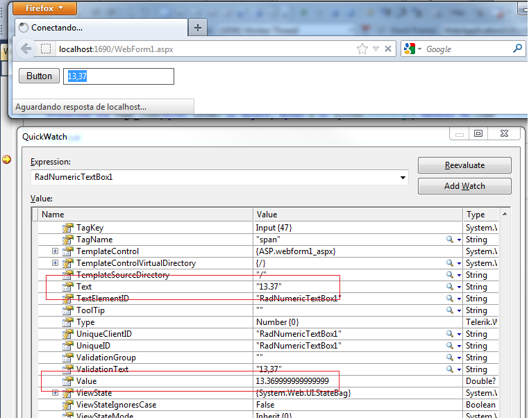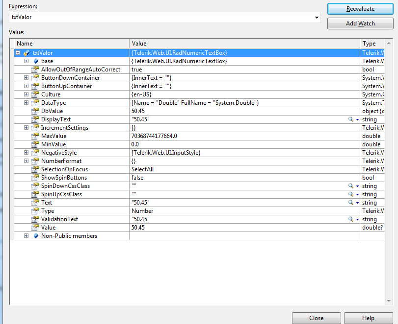 <telerik:RadNumerictextBox ID="txtValor" runat="server" MinValue="0"> <NumberFormat AllowRounding="true" DecimalDigits="2"></telerik:RadNumerictextBox>When I fill with the value "50,45" for example, text and value properties are as follows: