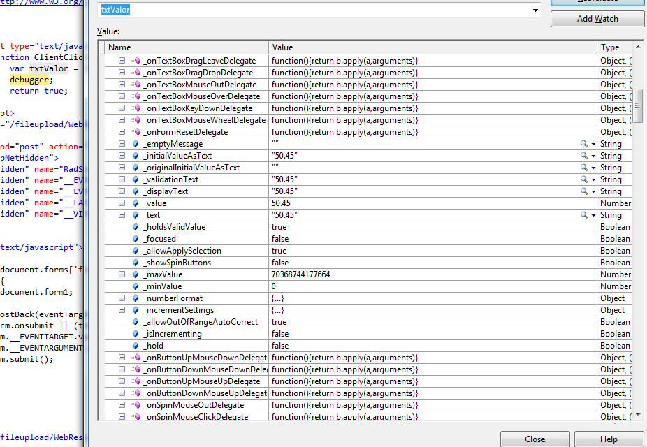 <telerik:RadNumericTextBox ID="txtValor" runat="server" MinValue="0"> <NumberFormat AllowRounding="true" DecimalDigits="2" /> </telerik:RadNumericTextBox> <asp:Button ID="Button1" runat="server" Text="Button" OnClientClick="return ClientClick();" OnClick="Button1_Click" />protected void Button1_Click(object sender, EventArgs e) { }<script type="text/javascript"> function ClientClick() { var txtValor = $find("<%= txtValor.ClientID %>"); debugger; return true; } </script>Thanks,