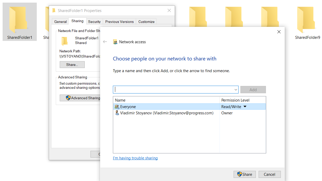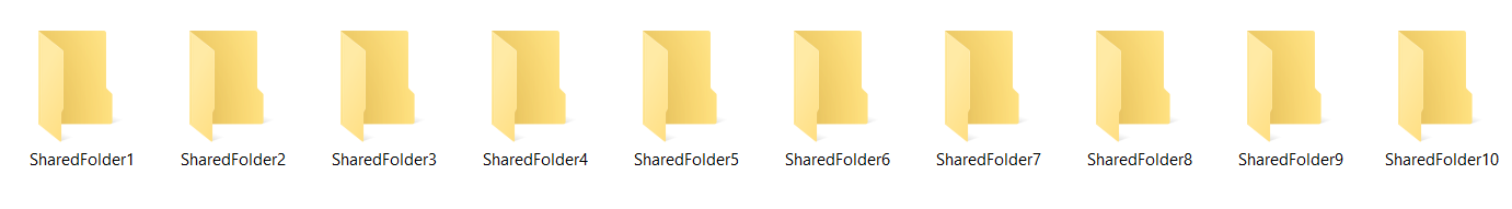 1. I created 10 folders on my machine, which I shared (you can check out the sharedfolders.png and sharedfoldersproperties.png).