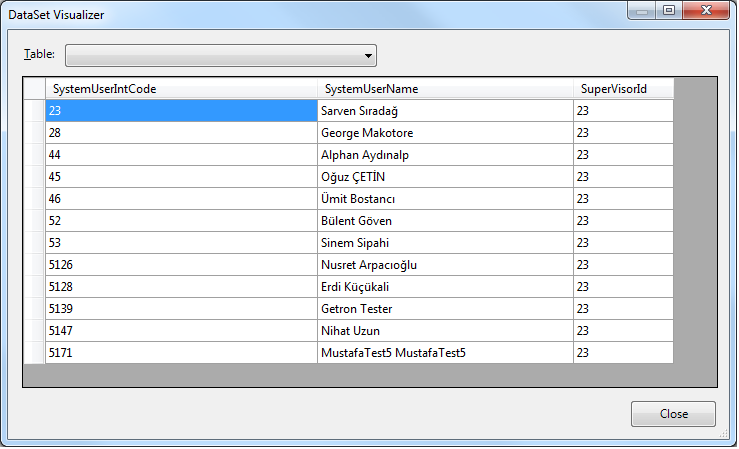 using System;using System.Collections.Generic;using System.Linq;using System.Web;using System.Web.UI;using System.Web.UI.WebControls;using Getron.AAM;using Getron.AAM.EntityManagement;using Getron.Core.Base.Objects;using System.Data;public partial class Sections_OrgChart_Default : EntityProtectedPage{ protected void Page_Load(object sender, EventArgs e) { OrgSchema osch = new OrgSchema(); QueryEntity qent = new QueryEntity(); qent.QueryEntityType = Getron.Core.Enums.EQueryEntityType.WhereCondition; qent.Query = "SupervisorId=@SupervisorId"; Getron.DBInterface.Parameter p0 = new Getron.DBInterface.Parameter("@SupervisorId", ParameterDirection.Input, DbType.Int64, 0); p0.Value = 23; qent.Parameters.Add(p0); DataTable dt = new DataTable(); dt = osch.GetCustomViewAll("OrgSchemaAllData", new List<string>() { "SystemUserIntCode", "SystemUserName", "SuperVisorId" }, qent); RadOrgChart1.DataTextField = "SystemUserName"; RadOrgChart1.DataFieldID = "SystemUserIntCode"; RadOrgChart1.DataFieldParentID = "SupervisorId"; RadOrgChart1.DataSource = dt; RadOrgChart1.DataBind(); }}And I attached my DataTable result panel picture.(dt object preview)