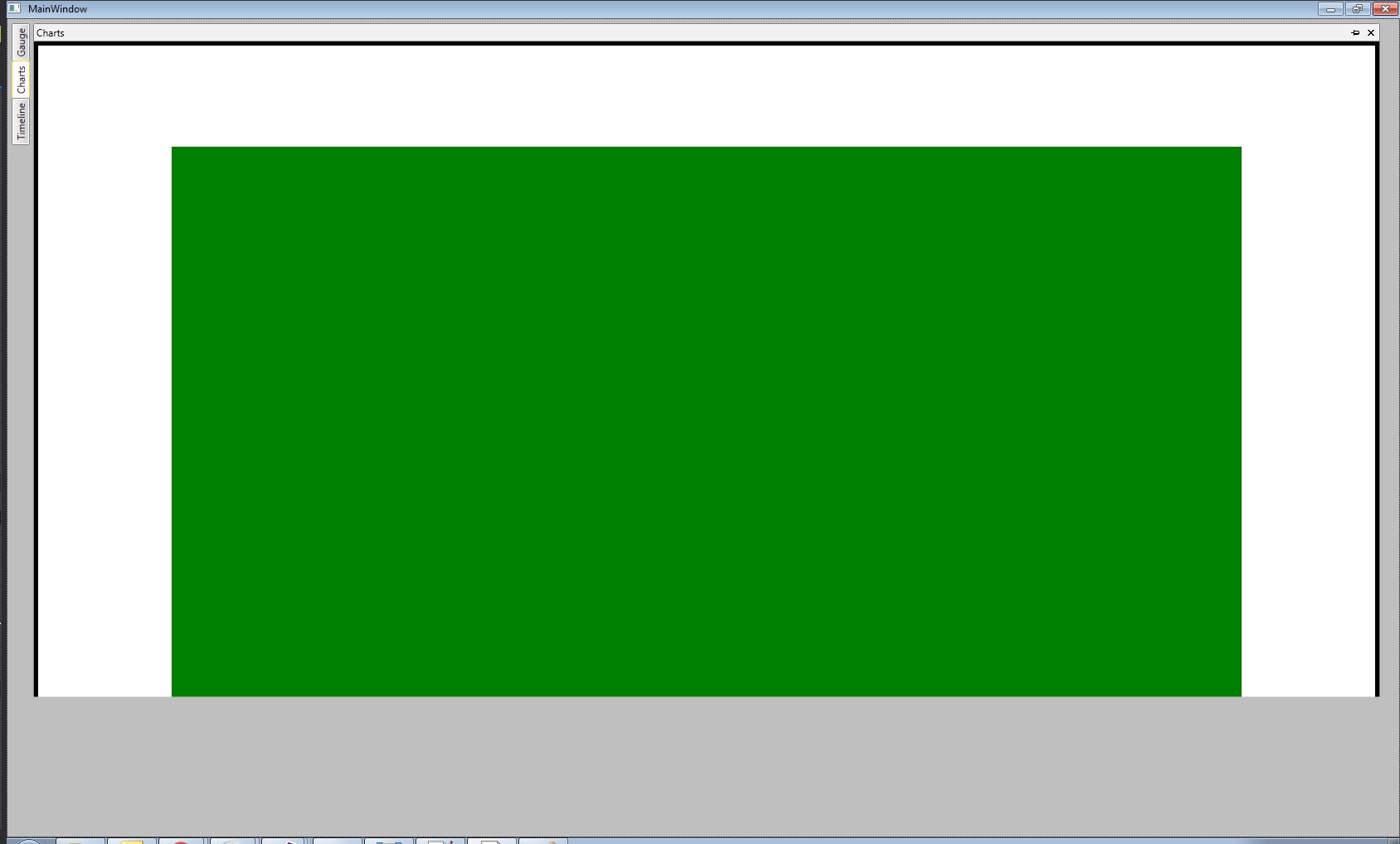 <Window x:Class="Docking_Test.MainWindow" xmlns:telerik="http://schemas.telerik.com/2008/xaml/presentation" Title="MainWindow" WindowState="Maximized"> <Grid> <telerik:RadDocking x:Name="radDock" HasDocumentHost="False"> <telerik:RadSplitContainer Orientation="Vertical"> <telerik:RadSplitContainer InitialPosition="DockedTop" telerik:ProportionalStackPanel.RelativeSize="100,80"> <telerik:RadSplitContainer InitialPosition="DockedLeft" telerik:ProportionalStackPanel.RelativeSize="40,100" Orientation="Vertical"> <telerik:RadPaneGroup> <telerik:RadPane Header="Gauge" ContextMenuTemplate="{x:Null}"> <Viewbox Stretch="Uniform"> <Border BorderThickness="5" BorderBrush="Black"> <Rectangle Fill="Red" Width="600" Height="700"/> </Border> </Viewbox> </telerik:RadPane> </telerik:RadPaneGroup> </telerik:RadSplitContainer> <telerik:RadSplitContainer InitialPosition="DockedRight" telerik:ProportionalStackPanel.RelativeSize="60,100" Orientation="Vertical"> <telerik:RadPaneGroup> <telerik:RadPane Header="Charts" ContextMenuTemplate="{x:Null}"> <Border BorderThickness="5" BorderBrush="Black"> <Rectangle Fill="Green" Width="1290" Height="700"/> </Border> </telerik:RadPane> </telerik:RadPaneGroup> </telerik:RadSplitContainer> </telerik:RadSplitContainer> <telerik:RadSplitContainer InitialPosition="DockedBottom" telerik:ProportionalStackPanel.RelativeSize="100,20"> <telerik:RadPaneGroup> <telerik:RadPane Header="Timeline" ContextMenuTemplate="{x:Null}"> <Border BorderThickness="5" BorderBrush="Black"> <Rectangle Fill="Blue" Width="1900" Height="300"/> </Border> </telerik:RadPane> </telerik:RadPaneGroup> </telerik:RadSplitContainer> </telerik:RadSplitContainer> </telerik:RadDocking> </Grid></Window>