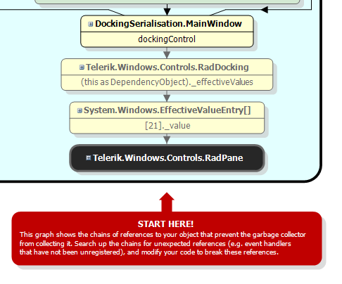 I've attached a screenshot of the ANTS profiler Retention Graph for the RadPane. I'm unable to attach a zip file containing a sample project which shows the problem (although you'll need to be running a memory profiler to see the bug), as I can only upload (gif, jpg, jpeg or png) but I have it ready to upload if there is an alternative upload facility.