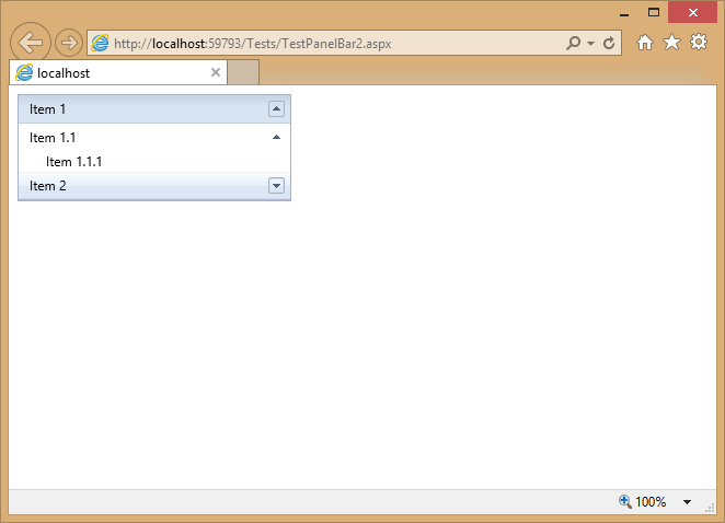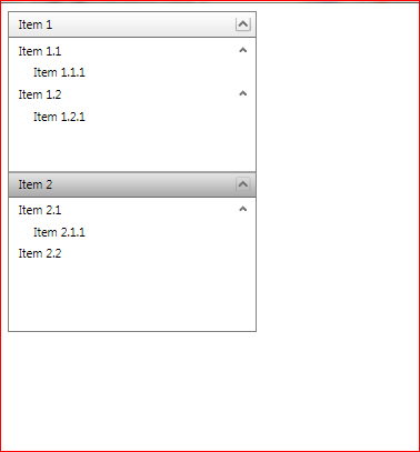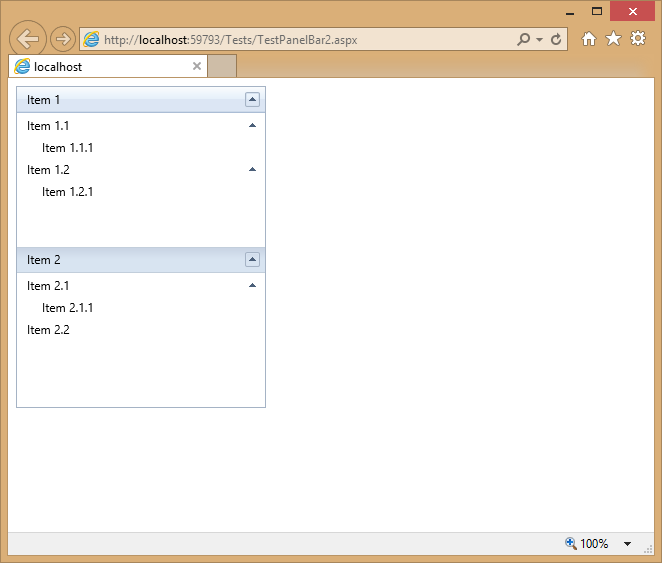 <telerik:RadPanelBar ID="RadPanelBar1" runat="server" CssClass="Demo" ExpandMode="FullExpandedItem" OnClientItemClicking="ExpandAllChildren"> <Items> <telerik:RadPanelItem Text="Item 1" runat="server"> <Items> <telerik:RadPanelItem Text="Item 1.1" runat="server"> </telerik:RadPanelItem> <telerik:RadPanelItem Text="Item 1.2" runat="server"> <Items> <telerik:RadPanelItem Text="Item 1.2.1" runat="server"> </telerik:RadPanelItem> </Items> </telerik:RadPanelItem> </Items> </telerik:RadPanelItem> <telerik:RadPanelItem Text="Item 2" runat="server"> <Items> <telerik:RadPanelItem Text="Item 2.1" runat="server"> <Items> <telerik:RadPanelItem Text="Item 2.1.1" runat="server"> </telerik:RadPanelItem> </Items> </telerik:RadPanelItem> <telerik:RadPanelItem Text="Item 2.2" runat="server"> </telerik:RadPanelItem> </Items> </telerik:RadPanelItem> <telerik:RadPanelItem Text="Item 3" runat="server"> <Items> <telerik:RadPanelItem Text="Item 3.1" runat="server"> </telerik:RadPanelItem> <telerik:RadPanelItem Text="Item 3.2" runat="server"> </telerik:RadPanelItem> </Items> </telerik:RadPanelItem> </Items></telerik:RadPanelBar>CSS: