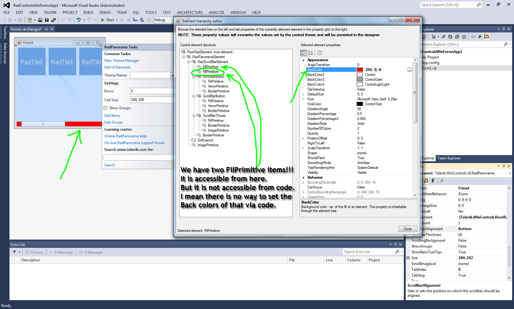 If you pay attention to the left column, you can see two FillPrimitive under RadScrollBarElement.