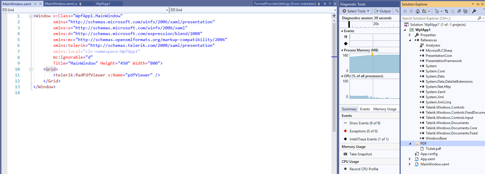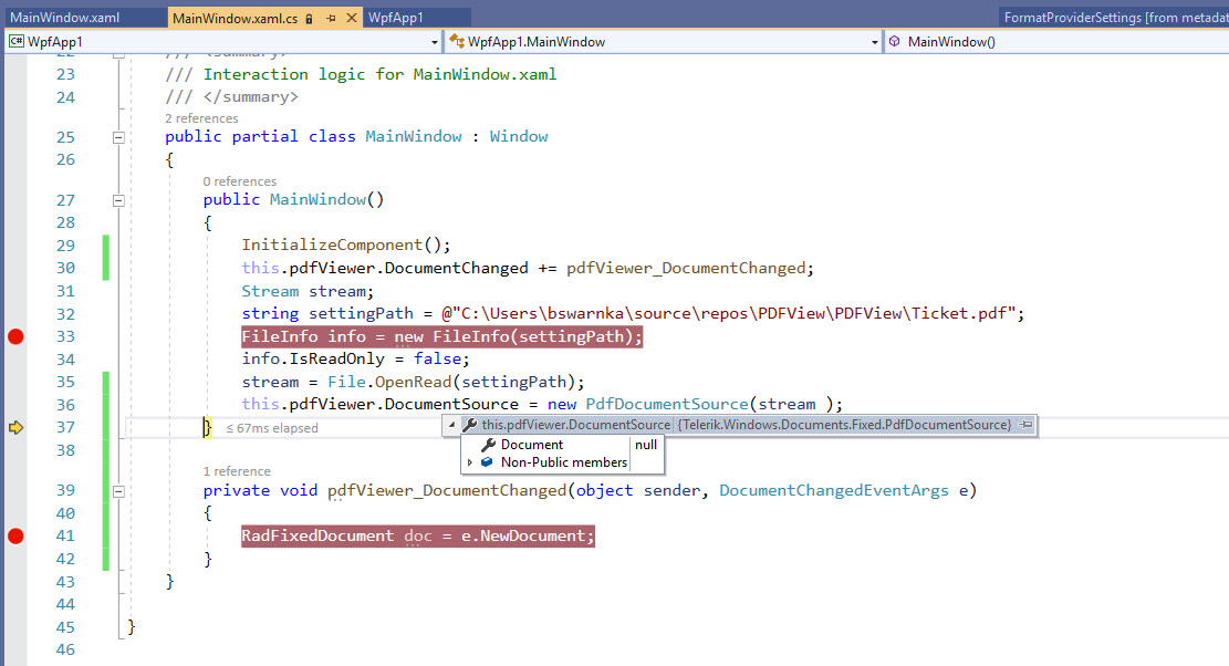 I am trying to open a PDF document in WPF via Telerik's native pdfDocumentViewer as well. (I want the user not to need Microsoft Word installed, or Adobe Acrobat pdf viewer installed)