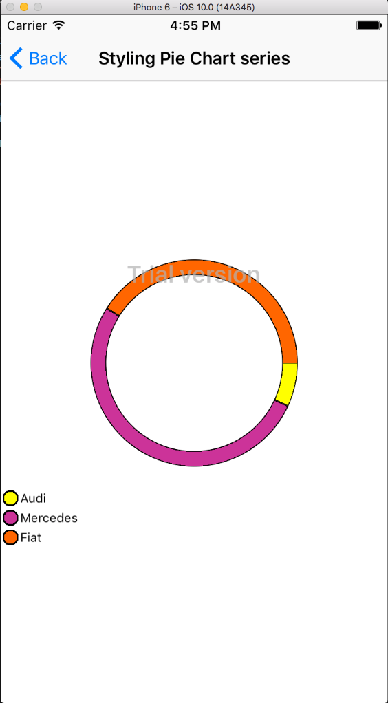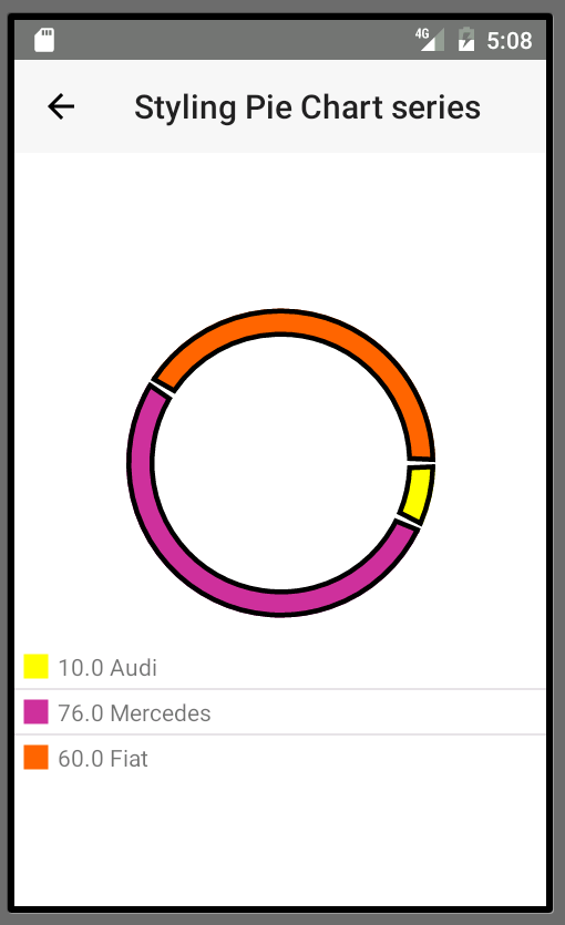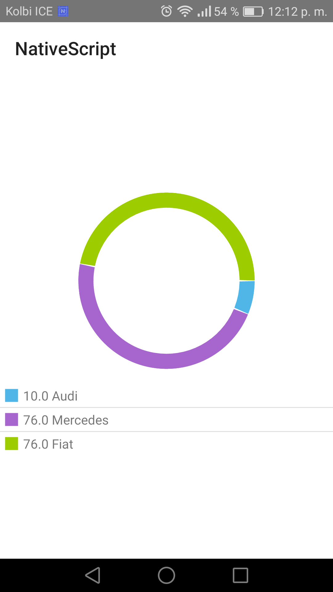 <GridLayout orientation="vertical" rows="*"> <RadPieChart height="400" allowAnimation="true" row="0"> <DonutSeries seriesName="pie" tkPieSeries selectionMode="None" outerRadiusFactor="0.9" expandRadius="0.25" innerRadiusFactor="0.85" [items]="pieSource" valueProperty="Amount" legendLabel="Brand"></DonutSeries> <RadLegendView tkPieLegend position="Bottom" offsetOrigin="BottomLeft" width="110"> </RadLegendView> <Palette tkPiePalette seriesName="pie"> <PaletteEntry tkPiePaletteEntry fillColor="#ffff00" strokeColor="#000000"> </PaletteEntry> <PaletteEntry tkPiePaletteEntry fillColor="#cc3399" strokeColor="#000000"> </PaletteEntry> <PaletteEntry tkPiePaletteEntry fillColor="#ff6600" strokeColor="#000000"> </PaletteEntry> </Palette> </RadPieChart></GridLayout>app.component.ts