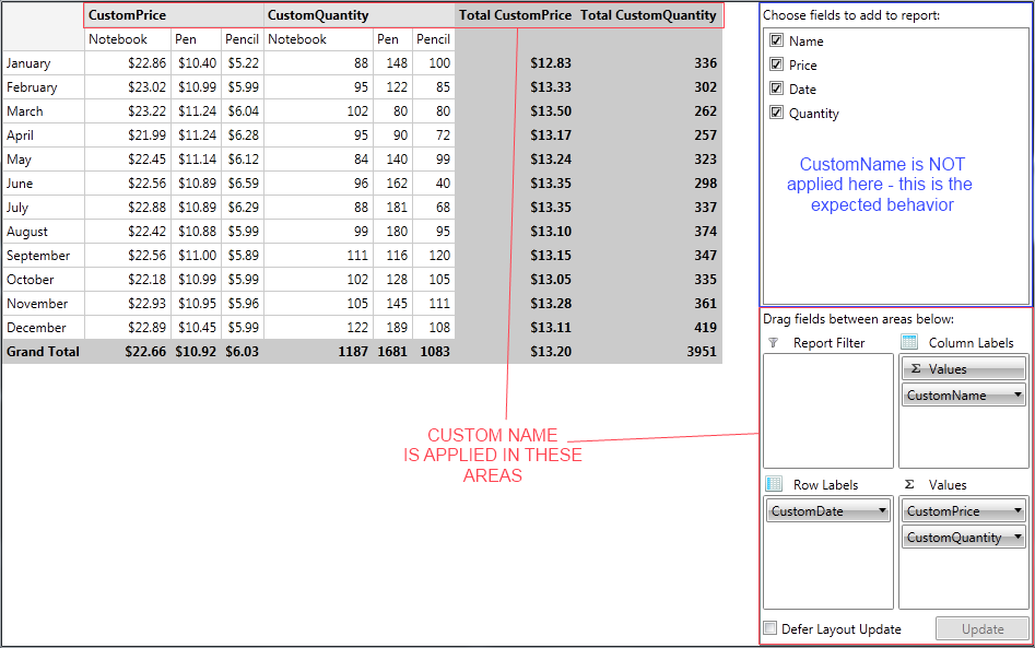 2) The properties of my POCO objects does not always have fully readable names for customers (such as SHTTransType). In the LocalDataSourceProvider I can set a CustomName which is picked up by the PivotGrid. Is it a bug/missing feature that the FieldList ignores those names, or is there another way to set custom names in the FieldList?