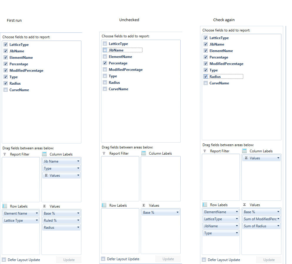 <pivot:LocalDataSourceProvider x:Key="DataSourceProvider" ItemsSource="{Binding SynthesisData}"> <pivot:LocalDataSourceProvider.RowGroupDescriptions> <pivot:PropertyGroupDescription PropertyName="ElementName" CustomName="Element Name" /> <pivot:PropertyGroupDescription PropertyName="LatticeType" CustomName="Lattice Type" /> </pivot:LocalDataSourceProvider.RowGroupDescriptions> <pivot:LocalDataSourceProvider.ColumnGroupDescriptions> <pivot:PropertyGroupDescription PropertyName="JibName" CustomName="Jib Name" /> <pivot:PropertyGroupDescription PropertyName="Type" /> </pivot:LocalDataSourceProvider.ColumnGroupDescriptions> <pivot:LocalDataSourceProvider.AggregateDescriptions> <pivot:PropertyAggregateDescription PropertyName="Percentage" CustomName="Base %" AggregateFunction="Max" StringFormat="#.00\%" /> <pivot:PropertyAggregateDescription PropertyName="ModifiedPercentage" CustomName="Ruled %" AggregateFunction="Max" StringFormat="#.00\%"/> <pivot:PropertyAggregateDescription PropertyName="Radius" CustomName="Radius" StringFormat="#.00 m" AggregateFunction="Max"/> </pivot:LocalDataSourceProvider.AggregateDescriptions> </pivot:LocalDataSourceProvider>...<pivot:RadPivotGrid x:Name="Pivot" Margin="8,8,292,7.565" DataProvider="{StaticResource DataSourceProvider}" ColumnSubTotalsPosition="Right"> <pivot:RadPivotGrid.RowGroupsExpandBehavior> <pivot:GroupsExpandBehavior Expanded="False" /> </pivot:RadPivotGrid.RowGroupsExpandBehavior> <pivot:RadPivotGrid.ColumnGroupsExpandBehavior> <pivot:GroupsExpandBehavior Expanded="False" /> </pivot:RadPivotGrid.ColumnGroupsExpandBehavior> </pivot:RadPivotGrid> <pivot:RadPivotFieldList Grid.Row="0" Margin="0,8,8,7.565" HorizontalAlignment="Right" Width="283" DataProvider="{StaticResource DataSourceProvider}" />