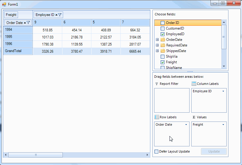 void ColumnLabelsControl_VisualItemFormatting(object sender, Telerik.WinControls.UI.VisualItemFormattingEventArgs args){ var data = args.VisualItem.Data.DataBoundItem as Telerik.WinControls.UI.PivotFieldList.IField; if (data != null && data.FieldInfo.Name == "OrderID") { ((RadItem)args.VisualItem.Children[0]).Text = "Order ID"; }}void RowLabelsControl_VisualItemFormatting(object sender, Telerik.WinControls.UI.VisualItemFormattingEventArgs args){ var data = args.VisualItem.Data.DataBoundItem as Telerik.WinControls.UI.PivotFieldList.ILabel; if (data != null && data.FieldInfo.Name == "OrderID") { ((RadItem)args.VisualItem.Children[0]).Text = "Order ID"; }}void FieldsControl_NodeFormatting(object sender, Telerik.WinControls.UI.TreeNodeFormattingEventArgs e){ if (e.Node.Text == "OrderID") { e.NodeElement.ContentElement.Text = "Order ID"; }}In the attachment you can find a sample demo and video which demonstrates the approach.