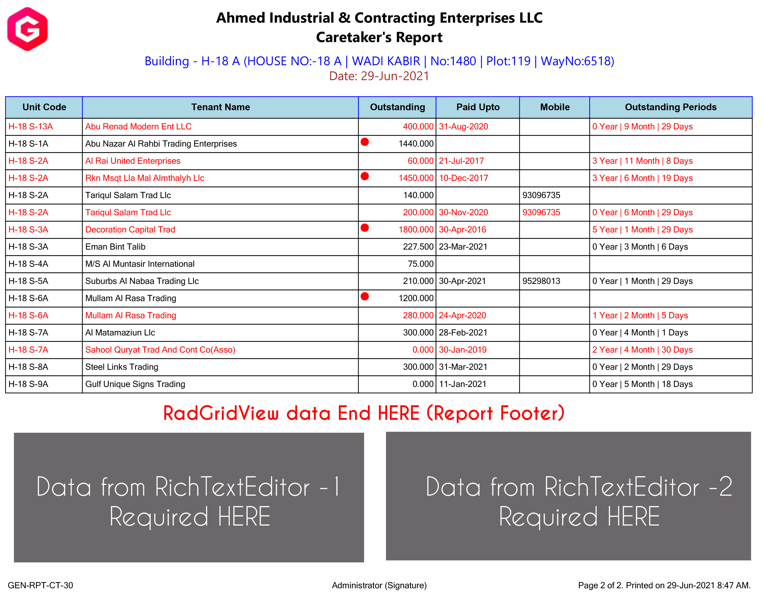 I have a RadGridView and two RadRichTextEditors in a form. In the printout, is it possible to display the texts from RadRichTextEditors just after the RadGridView printed? I mean, it should print on Report Footer. I don't have Telerik Reports License, so using RadPrintDocument. I am able to print Customized Headers & Footers with GridView data. Sample document attached.