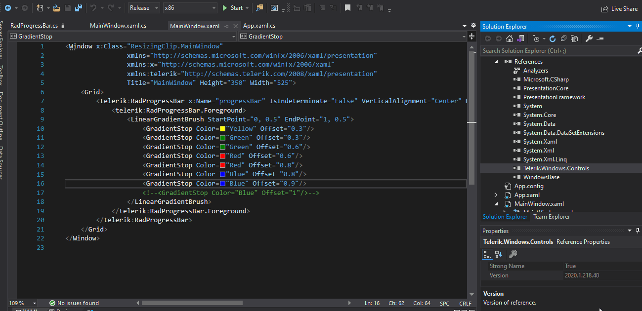 <telerik:RadProgressBar VerticalAlignment="Center" HorizontalAlignment="Stretch" Margin="30" Value="10" Minimum="1" Maximum="10" > <telerik:RadProgressBar.Foreground> <LinearGradientBrush StartPoint="0, 0.5" EndPoint="1, 0.5"> <GradientStop Color="Yellow" Offset="0.3"/> <GradientStop Color="Green" Offset="0.3"/> <GradientStop Color="Green" Offset="0.6"/> <GradientStop Color="Red" Offset="0.6"/> <GradientStop Color="Red" Offset="0.8"/> <GradientStop Color="Blue" Offset="0.8"/> <GradientStop Color="Blue" Offset="0.9"/> <!--<GradientStop Color="Blue" Offset="1"/>--> </LinearGradientBrush> </telerik:RadProgressBar.Foreground> </telerik:RadProgressBar>