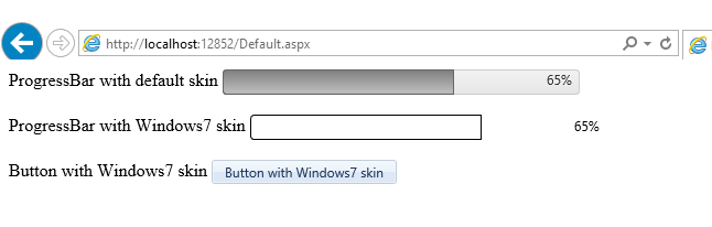 <%@ Page Language="C#" AutoEventWireup="true" CodeBehind="Default.aspx.cs" Inherits="ProgressBar.Default" %><%@ Register Assembly="Telerik.Web.UI" Namespace="Telerik.Web.UI" TagPrefix="telerik" %><!DOCTYPE html><html xmlns="http://www.w3.org/1999/xhtml"><head runat="server"> <title></title></head><body> <form id="form1" runat="server"> <telerik:RadScriptManager ID="radScriptManager" runat="server" /> <div> ProgressBar with default skin <telerik:RadProgressBar ID="radProgressBar1" runat="server" BarType="Percent" Value="65" /><br /><br /> ProgressBar with Windows7 skin <telerik:RadProgressBar ID="radProgressBar2" runat="server" BarType="Percent" Value="65" Skin="Windows7" /><br /><br /> Button with Windows7 skin <telerik:RadButton ID="radButton" runat="server" Text="Button with Windows7 skin" Skin="Windows7" /> </div> </form></body></html>