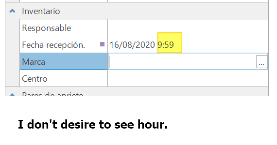 2. When it shows, I see dd/mm/yyyy and hour. I don't desire to see the hour. I attach the image.