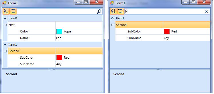 If I do a search, the RadPropertyGrid finds the name only in the second part of MyClass