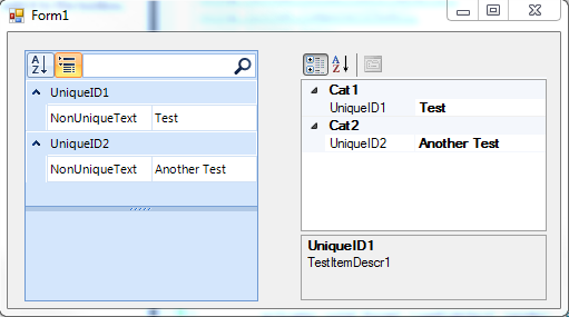 this.radPropertyGrid1.Items["UniqueID1"].Label = "NonUniqueText";