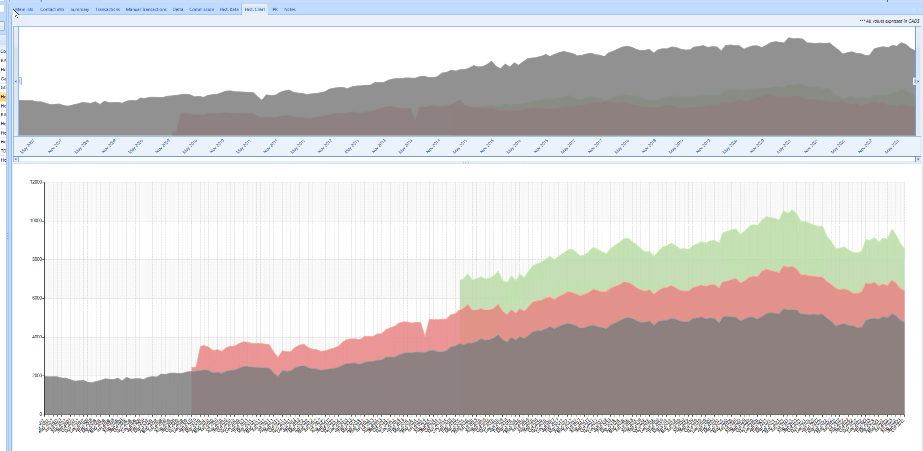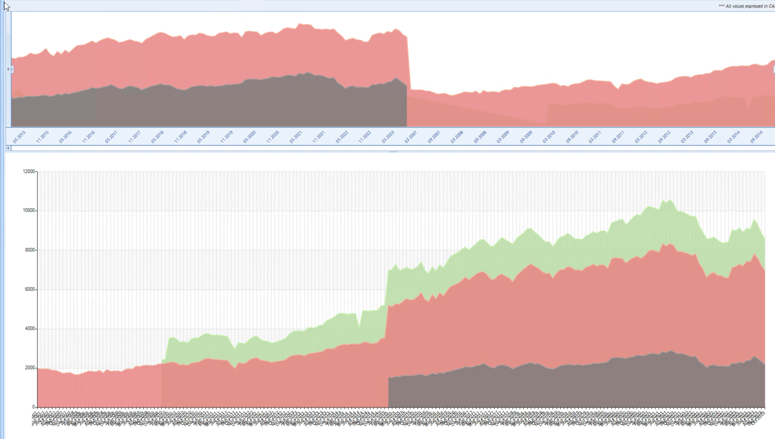 Notice that my bottom chart shows series as stacked. How can I get the RadRangeSelector also showing stacked series?