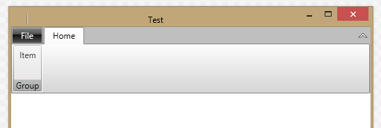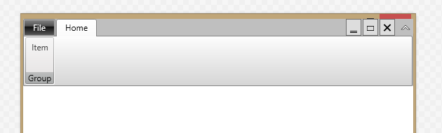 <telerik:RadRibbonWindow x:Class="TelerikTest.MainWindow" xmlns:telerik="http://schemas.telerik.com/2008/xaml/presentation" Title="MainWindow" Name="dlgMain" Height="350" Width="525" > <Grid> <!-- Custom close/maximise/minimise buttons --> <Grid Panel.ZIndex="1" Margin="180,0,26,0" Height="24" HorizontalAlignment="Stretch" VerticalAlignment="Top" > <Button Name="btnClose" HorizontalAlignment="Right" Width="22" Content="❌" ToolTip="Close" Click="btnClose_Click" /> <Button Name="btnMaximise" HorizontalAlignment="Right" Width="22" Content="▭" Margin="0,0,24,0" ToolTip="Toggle maximise" Click="btnMaximise_Click"/> <Button Name="btnMinimise" HorizontalAlignment="Right" Width="22" Content="‗‗" Margin="0,0,48,0" ToolTip="Minimise" Click="btnMinimise_Click"/> </Grid> <telerik:RadRibbonView Name="xRadRibbonBar" Title="Test" ApplicationName="" IsBackstageOpen="False" SelectedIndex="0" ApplicationButtonVisibility="Visible" TitleBarVisibility="Collapsed" ContentHeight="72" MinimizeButtonVisibility="Visible" > <telerik:RadRibbonView.ApplicationButtonContent> <TextBlock Text="File" /> </telerik:RadRibbonView.ApplicationButtonContent> <telerik:RadRibbonTab Header="Home" > <telerik:RadRibbonGroup Header="Group" > <telerik:RadRibbonButton Size="Large" Text="Item" > </telerik:RadRibbonButton> </telerik:RadRibbonGroup> </telerik:RadRibbonTab> </telerik:RadRibbonView> </Grid></telerik:RadRibbonWindow>