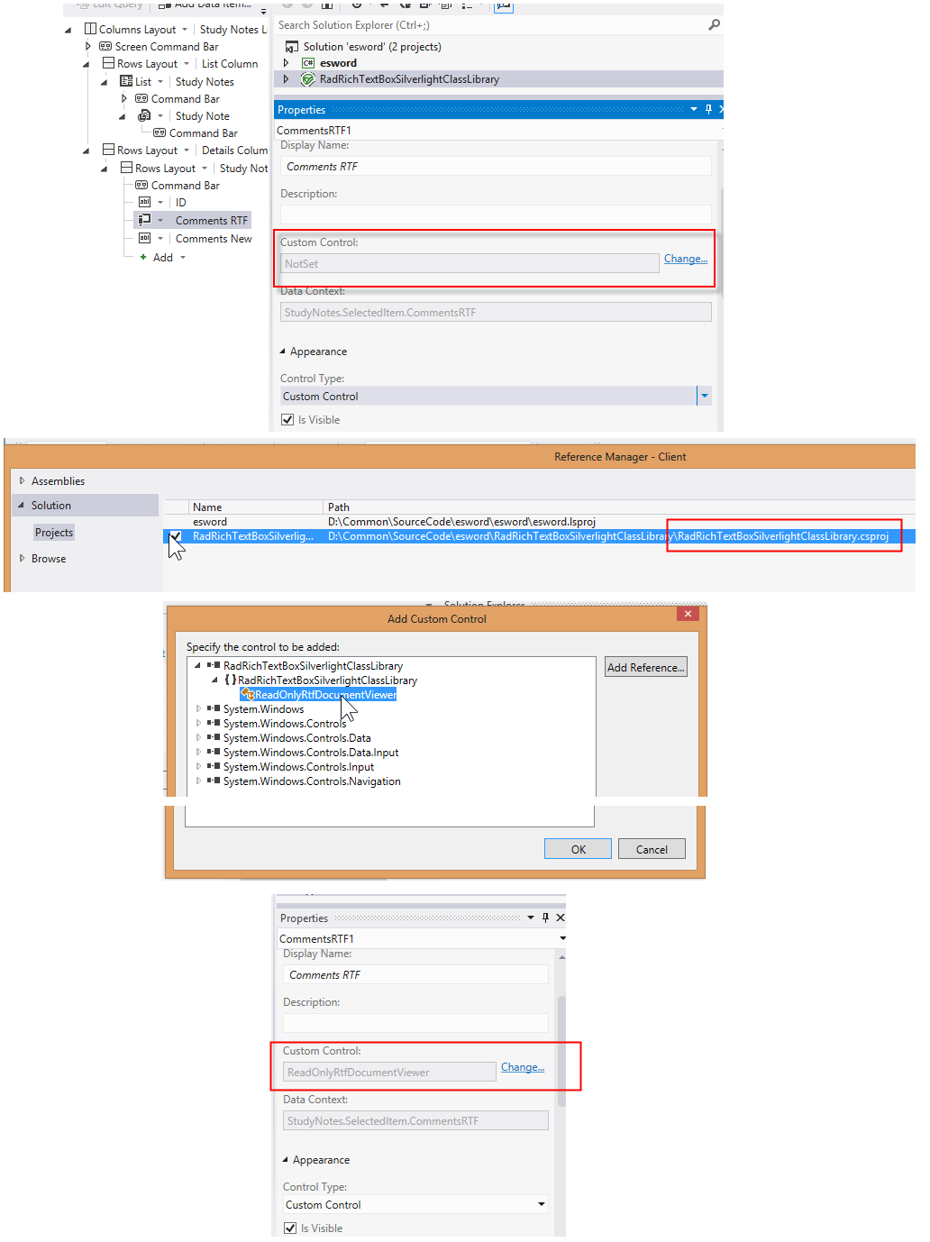 I mention this because the samples that I have found on the internet were based on prior versions of LS and things have changed. For example, a Silver Light Custom control can not be inside the LS project. Therefore I had to to create a seperate project which I called RadRichSilverLightClassLibrary. With in that project I created two Silverlight User Controls that utilized the Telerik RadRichTextBox controls.