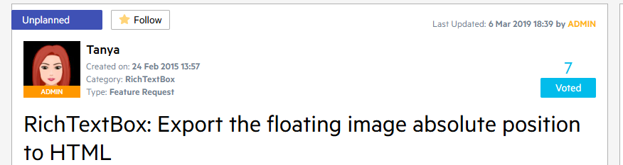 Thanks for the details. This is a known issue with the HTMLFormatProvider. You can track its progress, subscribe to status changes, and add your comment here: RichTextBox: Export the floating image absolute position to HTML.