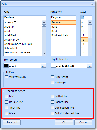 It also has a spot to do several different styles of underline (wave, dot-dashed, dot-dot-dashed, etc). However, for my purposes the only underline that will work is the default one (like this).