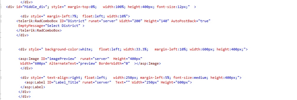 <telerik:RadAjaxManager ID="RadAjaxManager1" runat="server" DefaultLoadingPanelID="LoadingPanel1"> <AjaxSettings> <telerik:AjaxSetting AjaxControlID="thumbRotator"> <UpdatedControls> <telerik:AjaxUpdatedControl ControlID="imagePreview" LoadingPanelID="LoadingPanel1" /> <telerik:AjaxUpdatedControl ControlID="RadListView1" LoadingPanelID="LoadingPanel1" /> </UpdatedControls> </telerik:AjaxSetting> <telerik:AjaxSetting AjaxControlID="thumbRotator1"> <UpdatedControls> <telerik:AjaxUpdatedControl ControlID="imagePreview" LoadingPanelID="LoadingPanel1" /> <telerik:AjaxUpdatedControl ControlID="RadListView1" LoadingPanelID="LoadingPanel1" /> </UpdatedControls> </telerik:AjaxSetting> <telerik:AjaxSetting AjaxControlID="RadListBox1"> <UpdatedControls> <telerik:AjaxUpdatedControl ControlID="thumbRotator" LoadingPanelID="LoadingPanel1" /> <telerik:AjaxUpdatedControl ControlID="SqlDataSource2" LoadingPanelID="LoadingPanel1" /> <telerik:AjaxUpdatedControl ControlID="thumbRotator1" LoadingPanelID="LoadingPanel1" /> </UpdatedControls> </telerik:AjaxSetting> </AjaxSettings> </telerik:RadAjaxManager> <telerik:RadAjaxLoadingPanel ID="LoadingPanel1" runat="server" Transparency="30" EnableSkinTransparency="true" BackColor="#E0E0E0"> </telerik:RadAjaxLoadingPanel><telerik:RadTabStrip ID="RadTabStrip1" runat="server" SelectedIndex="0" MultiPageID="RadMultiPage1" CssClass="tabstyle" SelectedCssClass="SelectedTab" Align="Right" ForeColor="White" Skin="Sitefinity"> <Tabs> <telerik:RadTab Text="CURRENT THEME" > </telerik:RadTab> <telerik:RadTab Text="GALLERY" > </telerik:RadTab> <telerik:RadTab Text="UPLOAD PHOTOS"> </telerik:RadTab> </Tabs> </telerik:RadTabStrip> <telerik:RadMultiPage ID="RadMultiPage1" runat="server" SelectedIndex="0"> <telerik:RadPageView ID="RadPageView1" runat="server" CssClass="photowrap_cm"> <div id="picsarchivevertical_cm"> <table width="88" > <tr> <td > <img src="Images/arrow_up2.png" id="img_up" height="20" width="40" alt="" style="cursor: pointer" /> </td> </tr> <tr> <td> <telerik:RadRotator ID="thumbRotator" runat="server" RotatorType="Buttons" Width="72px" Height="240px" ItemHeight="60px" ItemWidth="73px" FrameDuration="1" ScrollDirection="Up,Down" OnItemClick="ShowImage" BorderStyle="None"> <ItemTemplate> <div> <img src='<%# DataBinder.Eval(Container.DataItem, "Image") %>' alt='gallery image' class="RotatorImage" /><br /> </div> </ItemTemplate> <ControlButtons UpButtonID="img_up" DownButtonID="img_down" /> </telerik:RadRotator> <asp:SqlDataSource ID="SqlDataSource2" runat="server" ConnectionString="<%$ ConnectionStrings:CMCONSUMER_IMPERIAL_WEB_QAConnectionString2 %>" SelectCommand="SELECT a.THUMBPATHFILENAME as [NAME] FROM ASSET a INNER JOIN PHOTO_OF_THE_DAY AS p ON p.ASSET_ID = a.ASSET_ID where Photo_Category = @ThemeID"> <SelectParameters> <asp:ControlParameter ControlID="RadListBox1" DefaultValue="2" Name="ThemeID" PropertyName="SelectedValue" /> </SelectParameters> </asp:SqlDataSource> </td> </tr> <tr> <td> <img src="Images/arrow_down2.png" id="img_down" height="20" width="40" alt="" style="cursor: pointer" /> </td> </tr> </table> </div> <div id="picsinglephoto_cm"> <asp:Image ID="imagePreview" runat="server" ImageUrl="Images/spacer.gif" Height="226px" Width="328px" AlternateText="preview" BorderWidth="0"></asp:Image><div id="picsauthor_cm"> <asp:Label ID="lblUserName" runat="server" Text="Name"></asp:Label> <br /> <asp:Label ID="lblPhotoDate" runat="server" Text="Date"></asp:Label></div> <div id="picslikeit_cm"> <asp:Label ID="lblLikes" runat="server" Text="Likes"></asp:Label> <asp:LinkButton ID="ImagelikeButton" runat="server" Text="Like" Style="text-decoration: none" /> <br /> </div> </div> <div id="form_photoOfTheDayComment" class="tm10 clear"> </div> <div id="picscomments_cm"> <asp:Image ID="comment_headshot" runat="server" Height="50" Width="50" CssClass="floatLeft rm10" /> <asp:TextBox ID="txtComment" runat="server" CssClass="form_comments fnt11 italic white" Text="Leave a comment..." TextMode="MultiLine"></asp:TextBox> <br /><p class="white fnt10 podCommentCopy"> By submitting this post, you grant USA Gold the permission to publish the comment on joinusagold.com</p> <asp:LinkButton ID="lnkCommentSubmit" runat="server" CssClass="fnt10 white strong rightArrow podCommentSubmit" CommandName="ContentId" OnCommand="lnkCommentSubmit_OnCommand">SUBMIT</asp:LinkButton> <telerik:RadListView ID="RadListView1" runat="server" DataSourceID="SqlDataSource1" AllowPaging="True" DataKeyNames="COMMENT_ID" ItemPlaceholderID="CommentContainer" Height="170" Skin="Sunset" onitemcommand="RadListView1_ItemCommand"> <ItemTemplate> <fieldset style="float: left; width: 280px;" > <legend><%# Eval("NAME") %></legend> <div> <div style="text-align: center; float: left"> <telerik:RadBinaryImage ID="RadBinaryImage2" runat="server" AlternateText="Avatar" ToolTip="Avatar" Width="50px" Height="50px" ResizeMode="Fit" ImageUrl='<%# Eval("AVATARPATH") %>' /></div> <div> <div> <%# Eval("DATE") %> </div> <div> <div> <%# Eval("COMMENT") %> </div> <div> <%# GetLikeText(Eval("LIKES").ToString()) %> it. <asp:LinkButton ID="likeButton" runat="server" Text="Like" CommandName="AddLike" CommandArgument='<%# Eval("Comment_ID") %>' Style="text-decoration: none" /><br /> </div> </div> </div> </div> </fieldset> </ItemTemplate> <LayoutTemplate> <fieldset> <asp:PlaceHolder ID="CommentContainer" runat="server" /> <telerik:RadDataPager ID="RadDataPager1" runat="server" PageSize="2" Skin="Black"> <Fields> <telerik:RadDataPagerButtonField FieldType="Numeric" /> </Fields> </telerik:RadDataPager> </fieldset> </LayoutTemplate> </telerik:RadListView> </div> </telerik:RadPageView> <telerik:RadPageView runat="server" ID="RadPageView2"> <div style="width: 700px"> <div style="float: left" class="picsarchivevertical_cm"> <table width="477" > <tr> <td colspan="3" align="center"> <img src="Images/arrow_up2.png" id="img_up2" height="20" width="40" alt="" style="cursor: pointer" /> </td> </tr> <tr> <td> <telerik:RadRotator ID="thumbRotator1" 