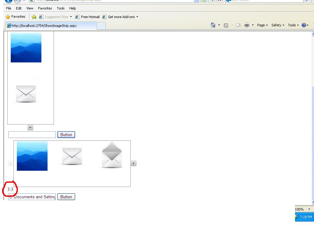 <script type="text/javascript"> function OnClientButtonClick(sender, args) {// debugger; var currentIndex = sender.get_currentItem().get_index(); var count = sender.get_items().length; var frames = Math.ceil(count / 3); var tot = 1; if (currentIndex % 3 == 0) { tot = 2 + (sender.get_currentItem().get_index() / 3); } else if (currentIndex == 0) tot = 1; var com = tot + '/' + frames; document.getElementById('<%= this.Label1.ClientID %>').innerHTML = com; }</script><telerik:RadRotator ID="ImageStrip_RadRotator" InitialItemIndex="0" runat="server" RotatorType="CoverFlowButtons" > <ItemTemplate> <telerik:RadBinaryImage ID="RadBinaryImage1" CssClass="itemTemplate" runat="server" DataValue='<%# Eval("Photo") == DBNull.Value? new System.Byte[0]: Eval("Photo") %>' AutoAdjustImageControlSize="false" /> </ItemTemplate> <ControlButtons OnClientButtonClick="OnClientButtonClick" /> </telerik:RadRotator>I have given the rotator dimensions and rotator type in .cs file,which is working fine. The rotator shows 3 images per frame.Suppose if there are 7 images then 3 frames will be shown. I'm getting the number of frames from "Var Frames" in the script.
