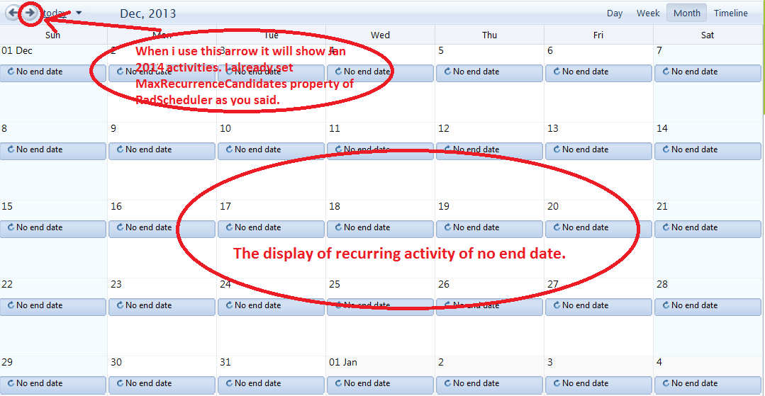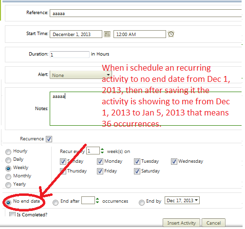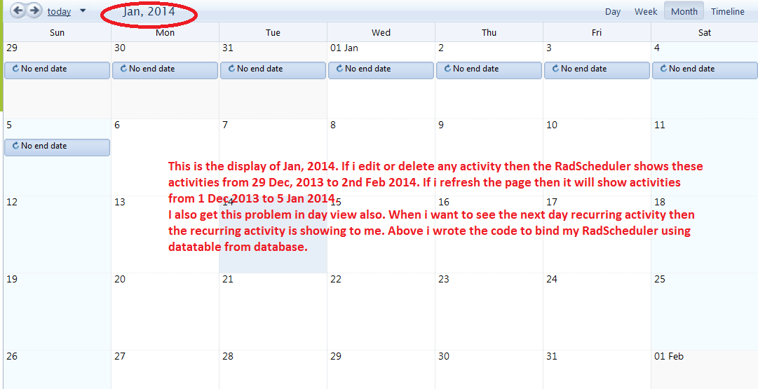 property of the RadScheduler. Still i have problem to bind the RadScheduler. I also want to know if in recurrence we select no end date in any type of Recurrence Type (Hourly, Dailt, Weekly, Monthly, Yearly) than how many times Radscheduler will show the recurring activity. It is also an another problem in Radscheduler for me. Because when i try to check this, i get different numbers, if i schedule an activity weekly then it will bind 30, 35, 40 times(Not fixed). How we can solve these problems? Please help me.