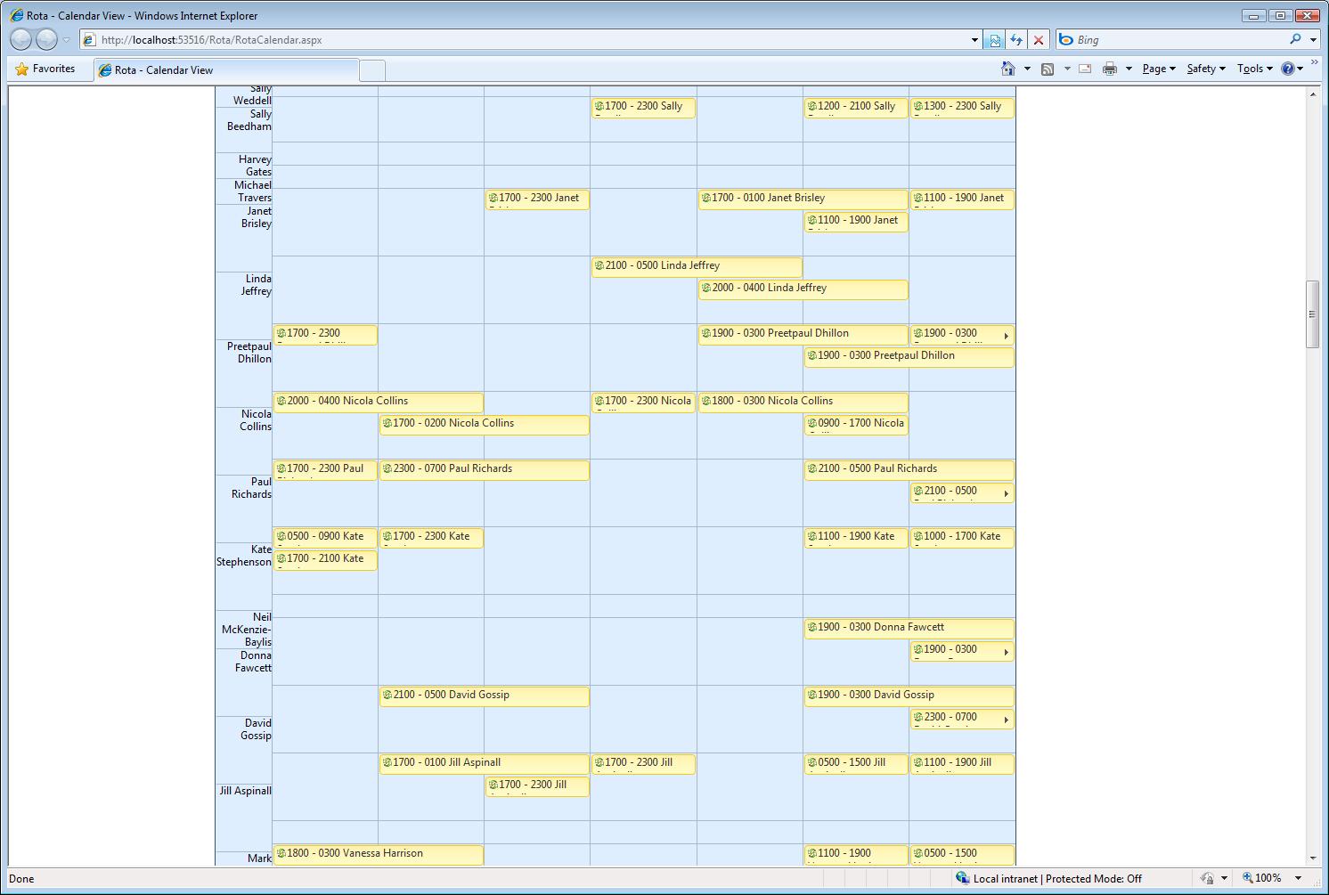 I'm having a problem with the RadScheduler, there are several columns, with the first column representing people. However when these people have nothing in the schedule for a particular week then the Scheduler becomes un-aligned. This works fine in firefox, however it I.E 8 the grid lines become offset as you can see in the attached document.