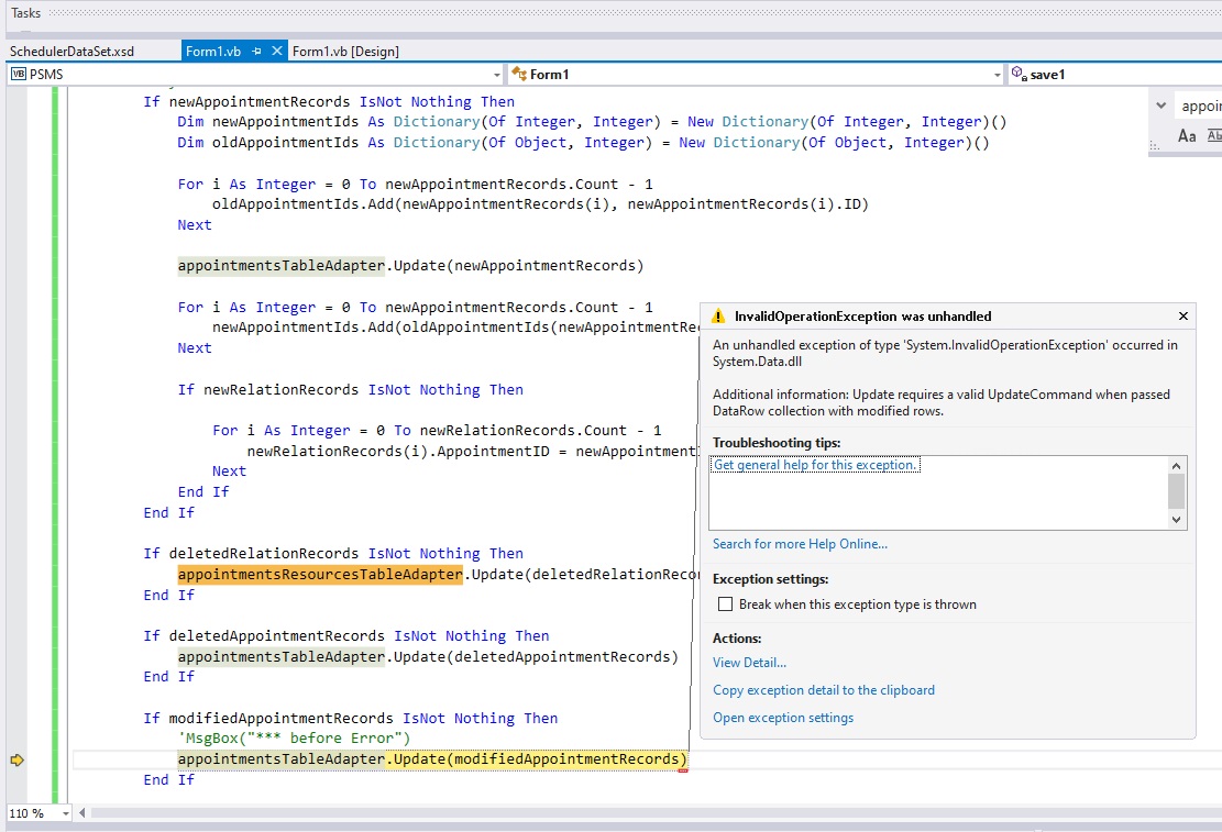 RadScheduler: Error received when trying to save modified appointment "Update requires a valid UpdateCommand when passed DataRow collection with modified rows."