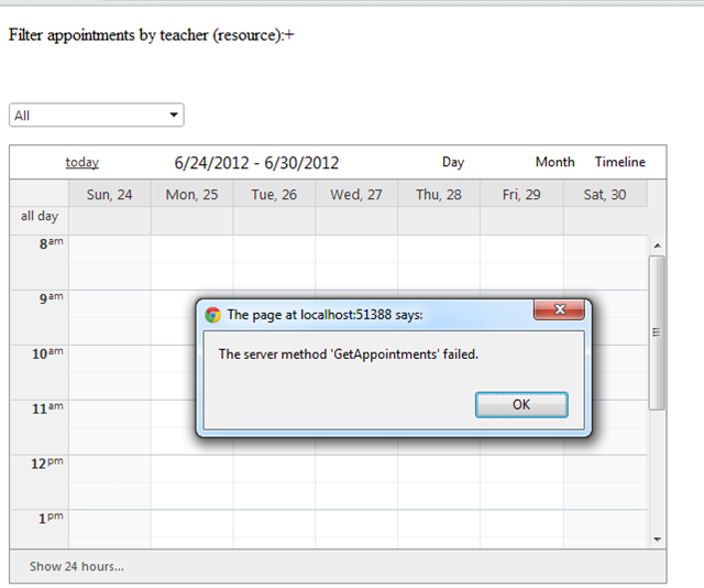 Just tried to put a simple RadScheduler with webservice binding in an usercontrol, but get a javascript error when loading the page. the error says "The server method 'GetAppointments' failed." the "OnClientRequestFailed" is fired as well. If I put the same radscheduler control directly in a aspx page, it works fine. Is there any specific settings for such scenario? Thanks in advance.