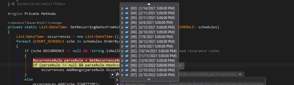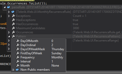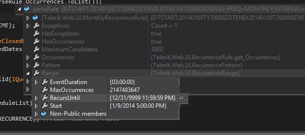 I am having an issue where I have set a schedule to have no end date, but it does not give us enough occurrences. It gives me only 98. When I look inside the ReccurenceRule object, it looks like it should be giving me more than 98 occurrences. My schedule does have one exception date. I have attached screenshots of my parse rule, list of given occurrences, the pattern, and the range allowed. Is this a bug in Telerik or do I have something set incorrectly?