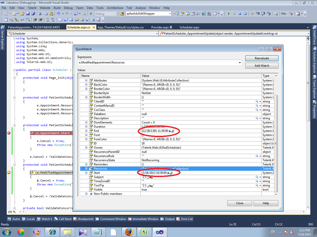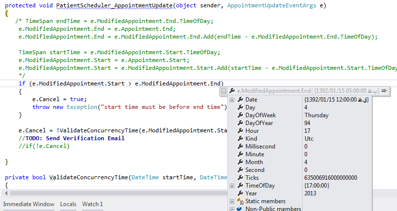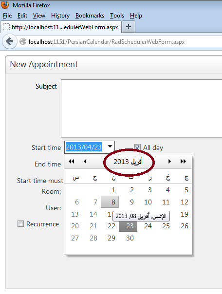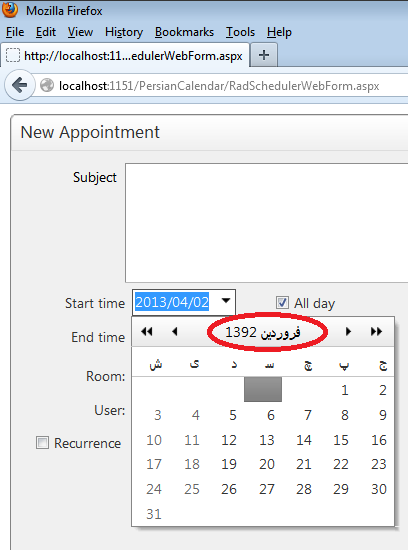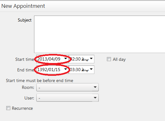 I have this problem in updating appointment with mouse click in main page. when I press mouse down and change start time of appointment I got an error because start Time is changed therefore is in georgian format but endtime is not changed therefore is in Persian Format. Persian year is less than georgian. I've got error: StartTIme should be less than endTime.