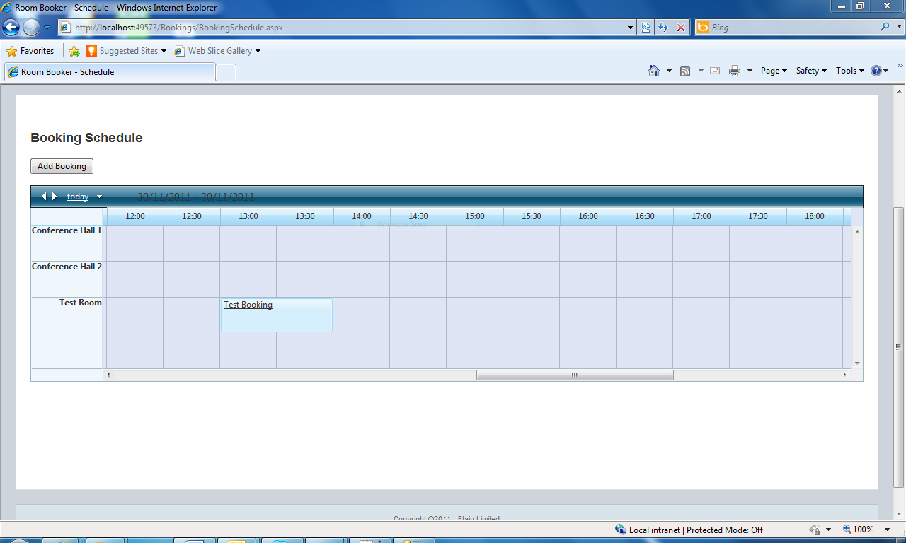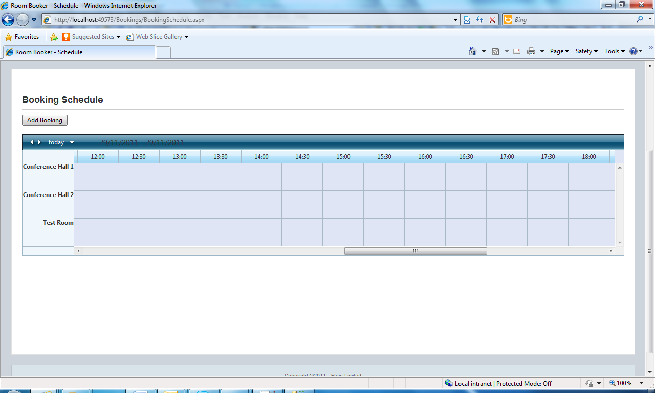 <telerik:RadScheduler runat="server" ID="rsBookings" DataSourceID="odsBookings" RowHeight="50px" TimelineView-HeaderDateFormat="dd/MM/yyyy" DataKeyField="BookingID" DataSubjectField="Description" DataStartField="StartDate" DataEndField="EndDate" GroupBy="Room" GroupingDirection="Vertical" StartEditingInAdvancedForm="false" SelectedView="TimelineView" TimelineView-TimeLabelSpan="1" TimelineView-SlotDuration="00:30:00" TimelineView-NumberOfSlots="48" TimelineView-ColumnHeaderDateFormat="HH:mm" DayStartTime="00:00" DayEndTime="23:59" ColumnWidth="80px" AllowDelete="false" AllowEdit="false" AllowInsert="false" CustomAttributeNames="Description, CompanyName, BookingID" OnDataBound="rsBookings_DataBound"> <AdvancedForm Modal="true" /> <TimelineView UserSelectable="false" /> <WeekView UserSelectable="false" /> <MonthView UserSelectable="false" /> <DayView UserSelectable="false" /> <ResourceTypes> <telerik:ResourceType KeyField="RoomID" Name="Room" TextField="Name" ForeignKeyField="RoomID" DataSourceID="odsRooms" /> </ResourceTypes> <AppointmentTemplate> <a href='BookingDetails.aspx?BookingID=<%# Eval ("BookingID") %>'><%# Eval("Description") %></a> <br /> <%# Eval("CompanyName")%> </AppointmentTemplate> <TimeSlotContextMenuSettings EnableDefault="true" /> <AppointmentContextMenuSettings EnableDefault="true" /> </telerik:RadScheduler> Code Behind: protected void Page_Load(object sender, EventArgs e) { rsBookings.SelectedDate = DateTime.Today; }