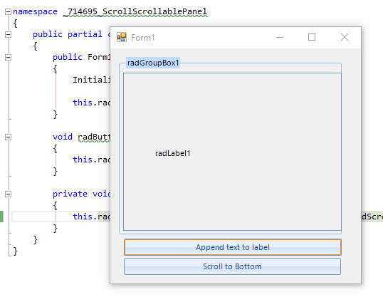 this.radScrollablePanel1.VerticalScrollbar.Value = this.radScrollablePanel1.VerticalScrollbar.Maximum;I hope this helps.