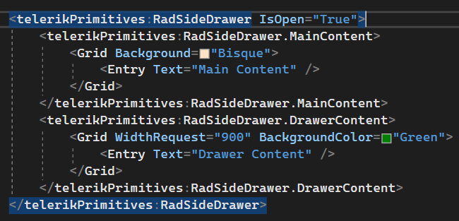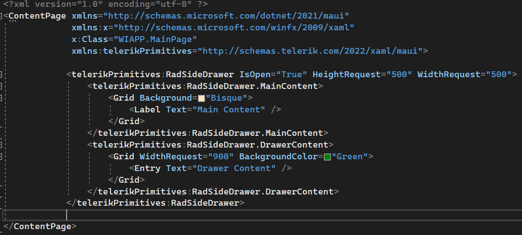 <ContentPage xmlns:telerik="http://schemas.telerik.com/2022/xaml/maui" ... > <telerik:RadSideDrawer x:Name="drawer" DrawerLength="200" IsOpen="True"> <telerik:RadSideDrawer.MainContent> <Grid> <Label Text="Main content" /> </Grid> </telerik:RadSideDrawer.MainContent> <telerik:RadSideDrawer.DrawerContent> <VerticalStackLayout Spacing="10"> <Label Text="Drawer content" /> </VerticalStackLayout> </telerik:RadSideDrawer.DrawerContent> </telerik:RadSideDrawer> </ContentPage>The "primitives" namespace is a very old naming scheme in .NET MAUI XAML, and is what makes me think you're attempting to use WinUI3 XAML. However, if your code is truly .NET MAUI XAML, it means you're using a version that is too old or are trying to use a new version with old code. Please update to the latest version and use the above example's exact code, including the xmlns.
