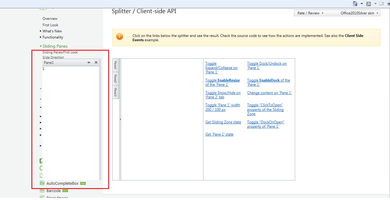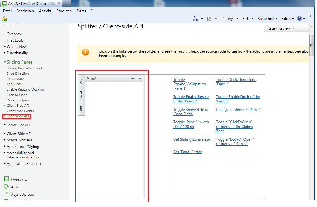 I tried the demo named Client-side API from Telerik website (http://demos.telerik.com/aspnet-ajax/splitter/examples/sp_clientsideapi/defaultcs.aspx).