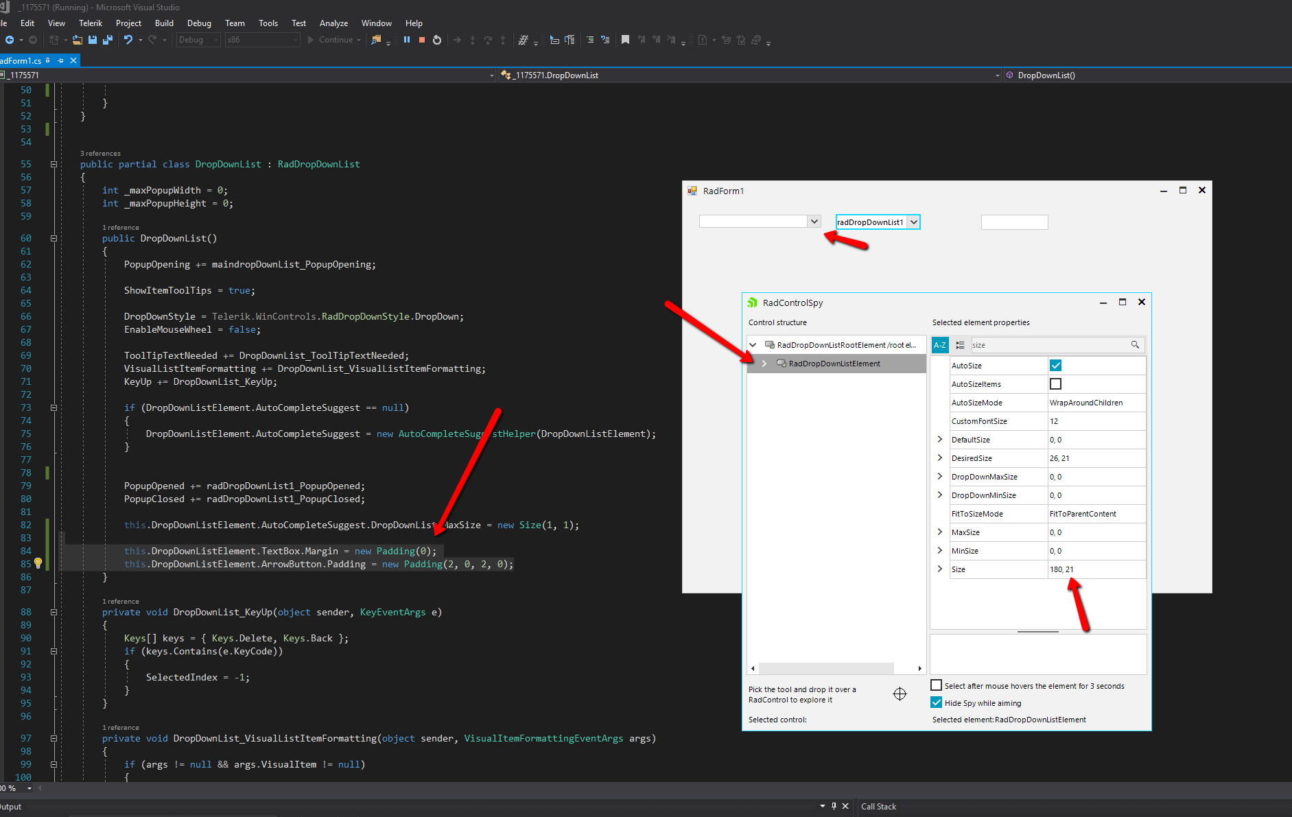 public DropDownList(){ PopupOpening += maindropDownList_PopupOpening; ShowItemToolTips = true; DropDownStyle = Telerik.WinControls.RadDropDownStyle.DropDown; EnableMouseWheel = false; ToolTipTextNeeded += DropDownList_ToolTipTextNeeded; VisualListItemFormatting += DropDownList_VisualListItemFormatting; KeyUp += DropDownList_KeyUp; if (DropDownListElement.AutoCompleteSuggest == null) { DropDownListElement.AutoCompleteSuggest = new AutoCompleteSuggestHelper(DropDownListElement); } PopupOpened += radDropDownList1_PopupOpened; PopupClosed += radDropDownList1_PopupClosed; this.DropDownListElement.AutoCompleteSuggest.DropDownList.MaxSize = new Size(1, 1);}Let me know how this works on your side.