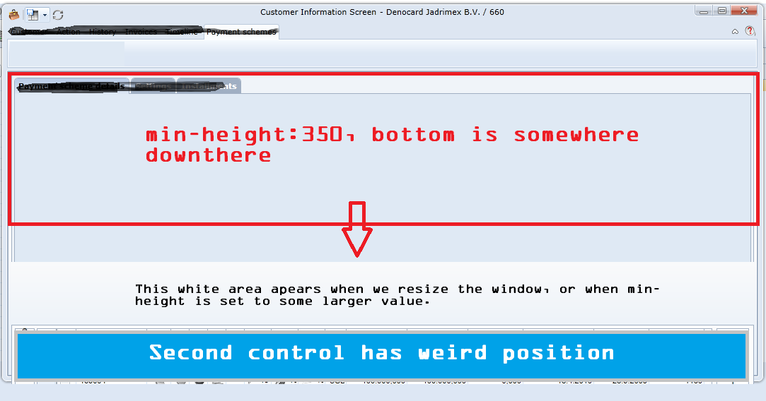 <telerik:RadDocking HorizontalAlignment="Stretch" Name="radDocking1" VerticalAlignment="Stretch" x:Class="Layout.Containers" mc:Ignorable="d" d:DesignHeight="600" d:DesignWidth="800" telerik:RadDocking.SerializationTag="DockCtrl" HasDocumentHost="False" xmlns:telerik="http://schemas.telerik.com/2008/xaml/presentation"> <telerik:RadSplitContainer x:Name="RootContainer" Orientation="Vertical" InitialPosition="DockedTop" HorizontalAlignment="Stretch" VerticalAlignment="Stretch"> <!--Actions - here different controls will be loaded --> <telerik:RadSplitContainer HorizontalAlignment="Stretch" VerticalAlignment="Stretch" InitialPosition="DockedTop" telerik:ProportionalStackPanel.RelativeSize="0, 70" Name="ActionContainer" > <telerik:RadPaneGroup telerik:RadDocking.SerializationTag="ActionPanelGroup" Name="ActionPanelGroup"> <!-- we load RadPane here containing one of several controls --> </telerik:RadPaneGroup> </telerik:RadSplitContainer> <!--Invoices--> <telerik:RadSplitContainer HorizontalAlignment="Stretch" InitialPosition="DockedTop" telerik:ProportionalStackPanel.RelativeSize="0, 30" Name="InvoiceGridContainer" > <telerik:RadPaneGroup telerik:RadDocking.SerializationTag="InvoiceGridPanelGroup" Name="InvoiceGridPanelGroup"> <!-- we load RadPane here containing other control --> </telerik:RadPaneGroup> </telerik:RadSplitContainer> </telerik:RadSplitContainer> </telerik:RadDocking>The issue occurs when we resize the window... only when we set min-height and resize or when min-height is bigger than some value... like.. bigger then 70% in this case, because of