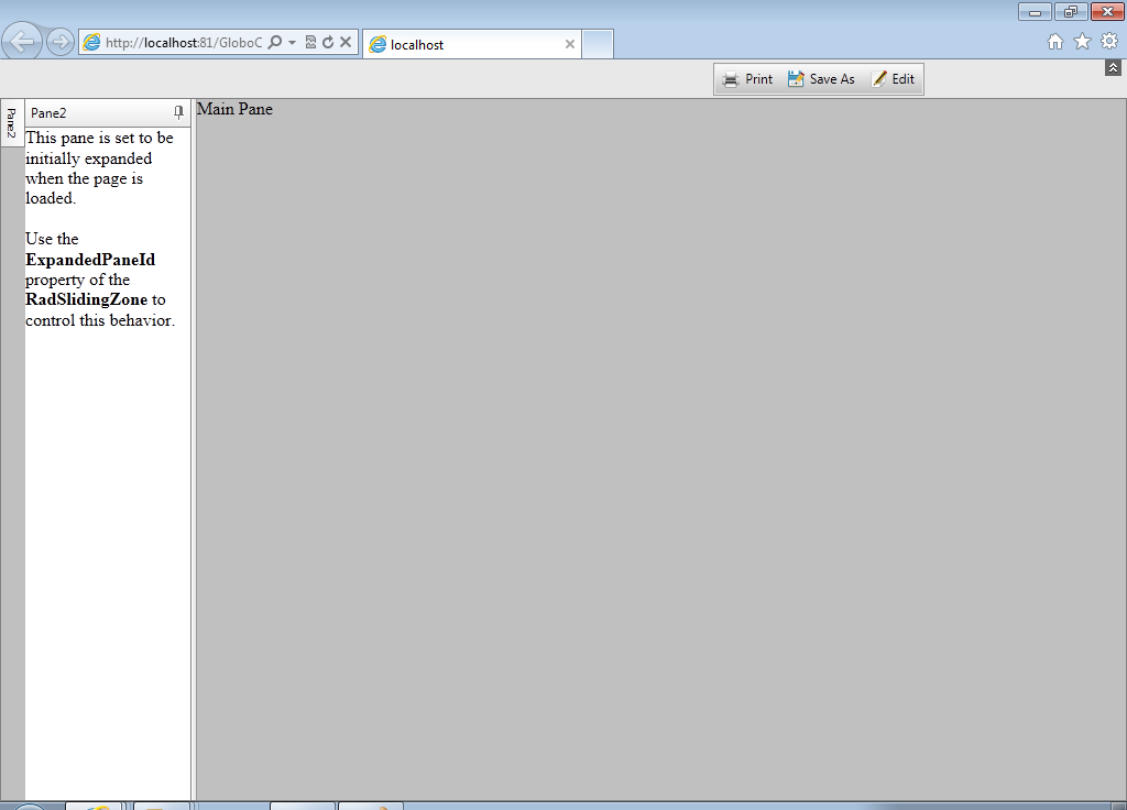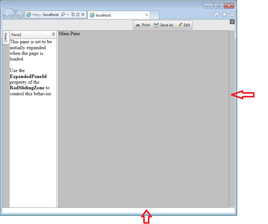 <telerik:RadSplitter id="RadSplitter1" CssClass="Splitter" runat="server" > <telerik:RadPane id="LeftPane" runat="server" width="22" Scrolling="None"> <telerik:RadSlidingZone id="SlidingZone1" runat="server" width="22" DockedPaneId="Pane1" ExpandedPaneId="Pane2" > <telerik:RadSlidingPane id="Pane2" title="Pane2" runat="server" width="150" minwidth="100">This pane is set to be initially expanded when the page is loaded. <br/><br/>Use the <b>ExpandedPaneId</b> property of the <b>RadSlidingZone</b> to control this behavior.</telerik:RadSlidingPane> </telerik:RadSlidingZone> </telerik:RadPane> <telerik:RadSplitBar id="RadSplitbar1" runat="server"></telerik:RadSplitBar> <telerik:RadPane id="MainPane" runat="server">Main Pane</telerik:RadPane> </telerik:RadSplitter>my javascript on load and resize