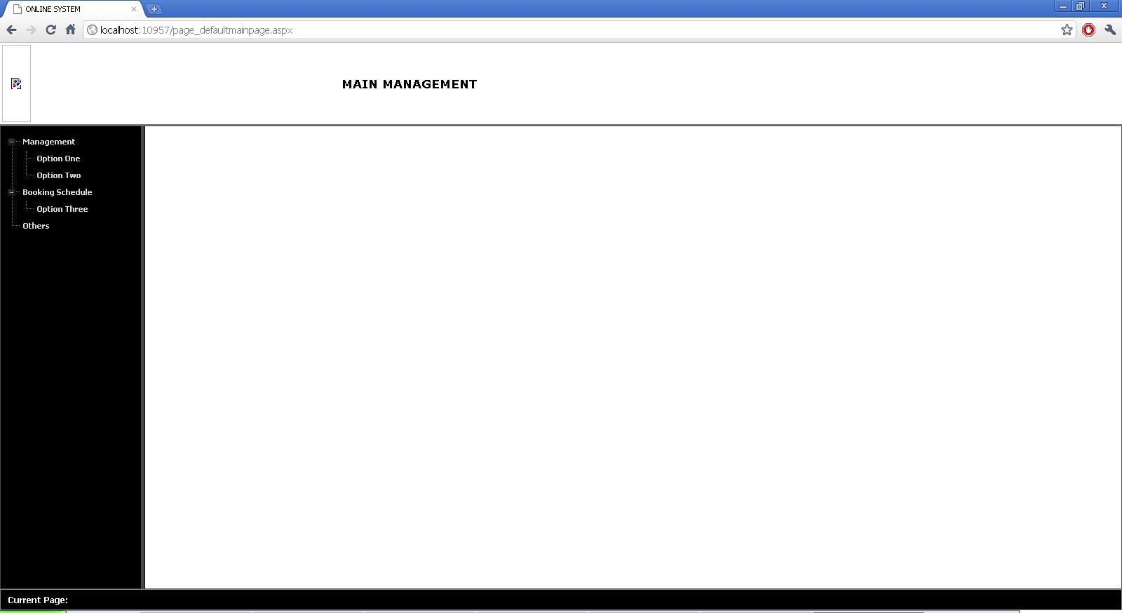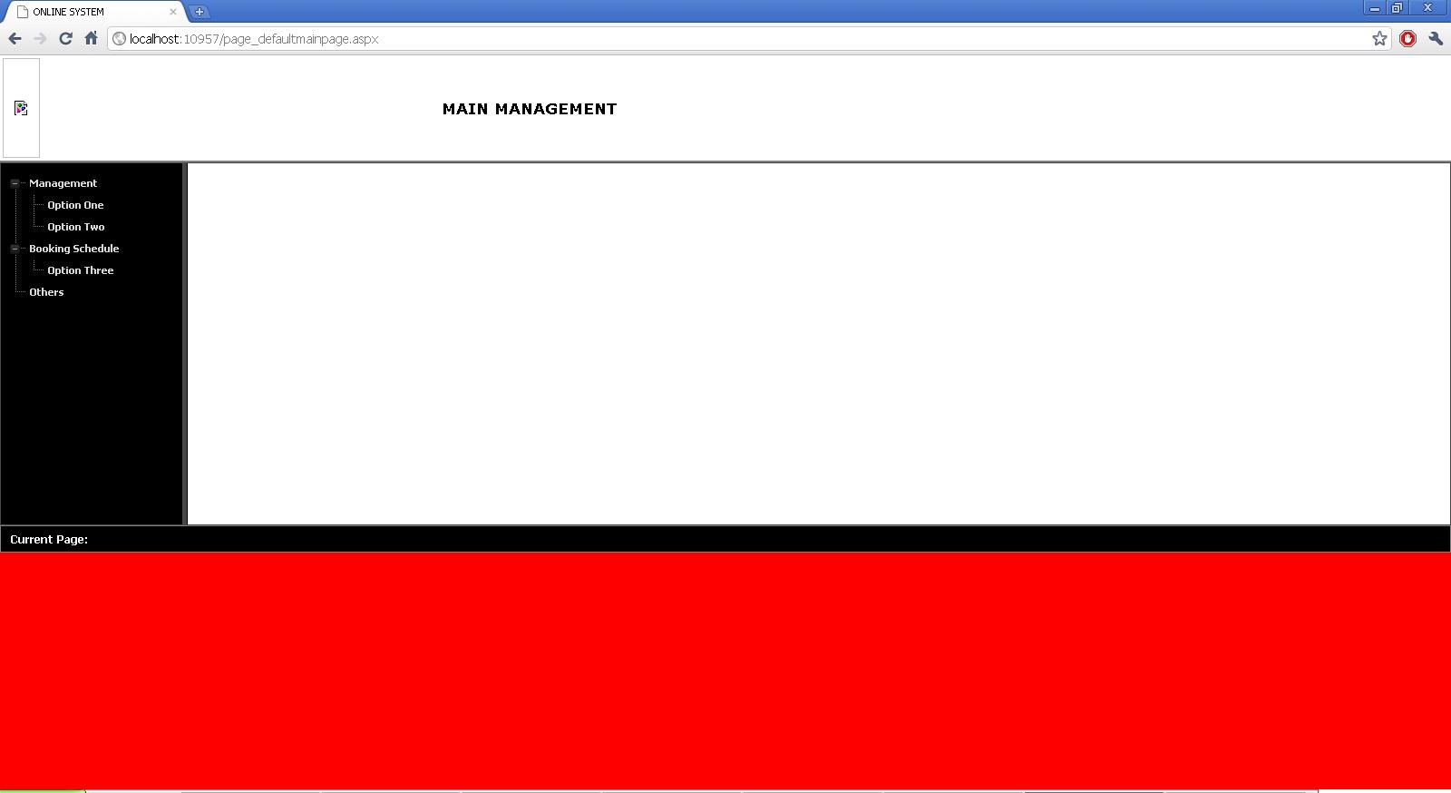 <%@ Page Language="C#" AutoEventWireup="true" CodeBehind="page_defaultmainpage.aspx.cs" Inherits="TravelBooking.page_defaultmainpage" %><%@ Register assembly="Telerik.Web.UI" namespace="Telerik.Web.UI" tagprefix="telerik" %><!DOCTYPE html PUBLIC "-//W3C//DTD XHTML 1.0 Transitional//EN" "http://www.w3.org/TR/xhtml1/DTD/xhtml1-transitional.dtd"><html xmlns="http://www.w3.org/1999/xhtml"><head id="Head1" runat="server"> <meta http-equiv="X-UA-Compatible" content="IE=7" /> <title>ONLINE SYSTEM</title> <style type="text/css"> html, body, form { margin: 0px; padding: 0px; height: 100%; width: 100%; overflow: hidden; } </style></head><body style="height: 100%; margin: 0px; overflow: hidden;"> <form id="form1" runat="server"> <telerik:RadScriptManager ID="ExRadScriptManager" runat="server"> </telerik:RadScriptManager> <telerik:RadAjaxManager ID="ExRadAjaxManager" runat="server"> <AjaxSettings> <telerik:AjaxSetting AjaxControlID="LeftPane"> <UpdatedControls> <telerik:AjaxUpdatedControl ControlID="MainSplitter" LoadingPanelID="LoadingPanelAnimated" UpdatePanelRenderMode="Inline"> </telerik:AjaxUpdatedControl> </UpdatedControls> </telerik:AjaxSetting> </AjaxSettings> </telerik:RadAjaxManager> <telerik:RadAjaxLoadingPanel ID="LoadingPanelAnimated" runat="server" BackColor="White" Transparency="38" MinDisplayTime="3000" Height="800px"> <table cellpadding="0" cellspacing="0" style="width: 100%; height: 100%;"> <tr> <td align="center" valign="middle" style="padding-bottom: 100px"> <img alt="Loading..." src='images/ajax-loader.gif' style="border: 0;" /> </td> </tr> </table> </telerik:RadAjaxLoadingPanel> <table style="border-style: solid; border-width: 0px 0px 2px 0px; border-color: #808080; width: 100%;"> <tr> <td width="480"> <asp:ImageButton ID="ImageButton1" runat="server" ImageUrl="" PostBackUrl="~/management.aspx" Height="110px" /> </td> <td> <asp:Label ID="Label1" runat="server" Font-Bold="True" Font-Names="Verdana" Font-Size="13pt" Text="MAIN MANAGEMENT"></asp:Label> </td> </tr> </table> <div runat="server" id="super" style="width: 100%; height: 100%; background-color: #FF0000;"> <telerik:RadSplitter ID="MainSplitter" runat="server" Skin="Black" Width="100%" Height="100%" HeightOffset="148" VisibleDuringInit="false"> <telerik:RadPane ID="LeftPane" runat="server" Width="200px" BackColor="Black" BorderStyle="Solid"> <div style="margin-top: 10px; margin-left: 8px; background-color: #000000;"> <telerik:RadTreeView ID="ExLeftNavigator" runat="server" Skin="Black" Font-Bold="True" Font-Names="Tahoma" Font-Size="8pt" > <Nodes> <telerik:RadTreeNode runat="server" Text="Management" Expanded="True"> <Nodes> <telerik:RadTreeNode runat="server" Text="Option One"> </telerik:RadTreeNode> <telerik:RadTreeNode runat="server" Text="Option Two"> </telerik:RadTreeNode> </Nodes> </telerik:RadTreeNode> <telerik:RadTreeNode runat="server" Text="Booking Schedule" Expanded="True"> <Nodes> <telerik:RadTreeNode runat="server" Text="Option Three"> </telerik:RadTreeNode> </Nodes> </telerik:RadTreeNode> <telerik:RadTreeNode runat="server" Text="Others"> </telerik:RadTreeNode> </Nodes> </telerik:RadTreeView> </div> </telerik:RadPane> <telerik:RadSplitBar ID="RadSplitBar1" runat="server" /> <telerik:RadPane ID="ContentPane" runat="server" BackColor="White"> </telerik:RadPane> </telerik:RadSplitter> <table style="border: 1px solid #808080; width: 100%; background-color: #000000; height: 30px;"> <tr> <td width="480"> <asp:Label ID="Label3" runat="server" Text="Current Page:" Font-Bold="True" Font-Names="Tahoma" Font-Size="9pt" ForeColor="White"></asp:Label> <asp:Label ID="lbCurrentPage" runat="server" Font-Bold="True" Font-Names="Tahoma" Font-Size="9pt" ForeColor="White"></asp:Label> </td> <td> </td> </tr> </table> </div> </form></body></html>