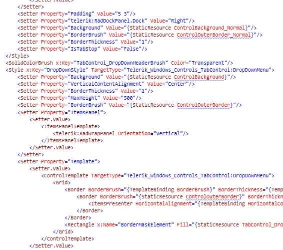 I've styled the radtabcontrol to suffice but have a border in the template I need to make transparent. The problem occurs when I create a copy of the template it immediately breaks the bindings like Background_Normal & Background_InnerNormal etc. I know exactly how to fix the border for my template, but how do I re-reference all the static bindings so it builds again? They don't appear to carry over when a copy of the template is made?