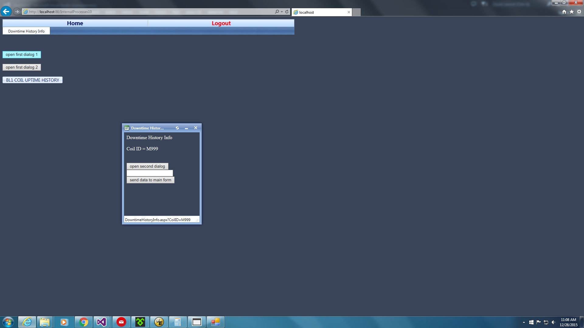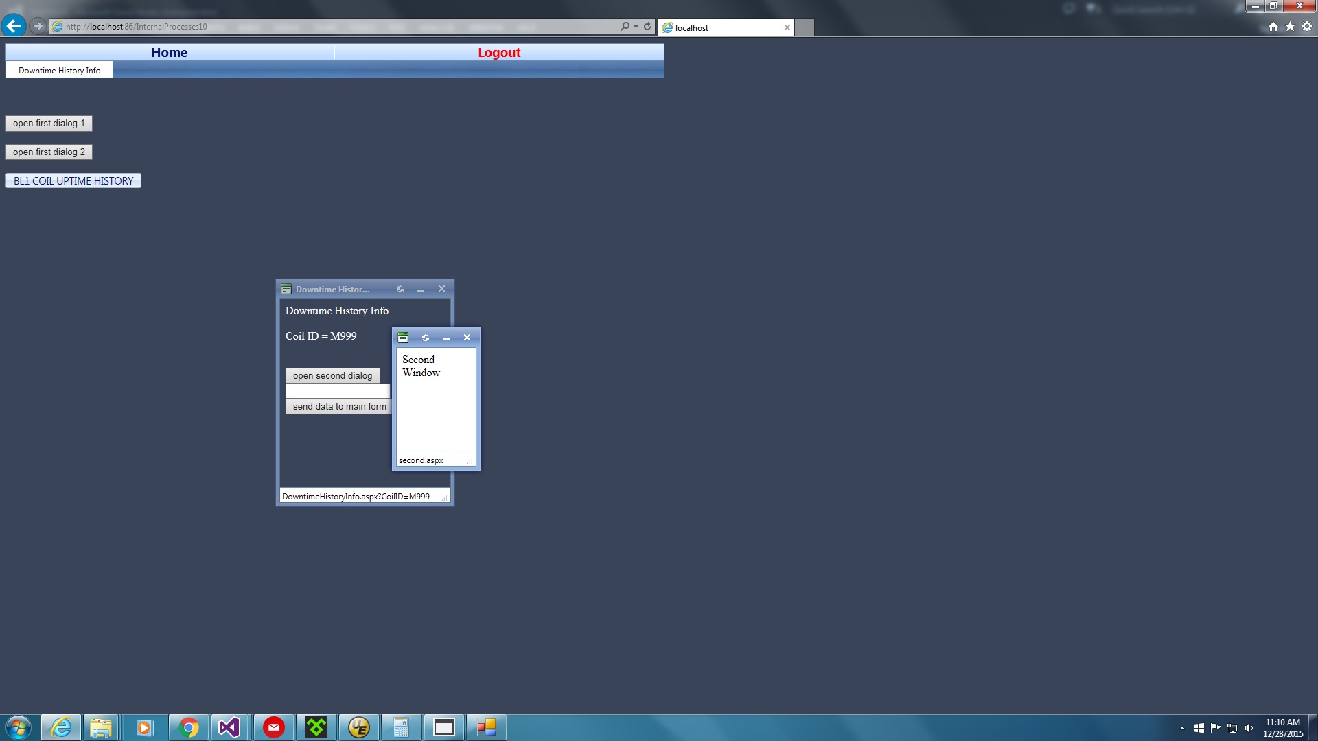 Partial Class DowntimeHistoryInfo Inherits System.Web.UI.Page Protected Sub Page_Load(sender As Object, e As EventArgs) Handles Me.Load Label2.Text = "Coil ID = " & UCase(Request.QueryString("CoilID")) End SubEnd ClassCode of ASP.Net page opened in a RadWindow from first RadWindow: