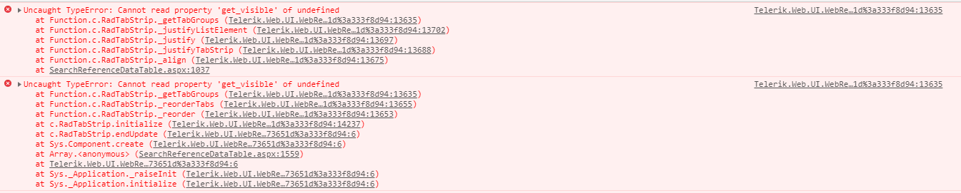 1.Uncaught TypeError: Cannot read property 'get_visible' of undefined - this one is caused by Radtabstrip "ReorderTabsOnSelect" Attribute.