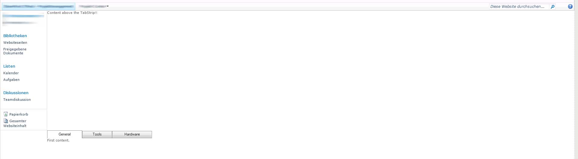 <%@ Register Assembly="Telerik.Web.UI, Version=2011.2.712.35, Culture=neutral, PublicKeyToken=121fae78165ba3d4" Namespace="Telerik.Web.UI" TagPrefix="telerik" %><asp:Content ID="PageHead" ContentPlaceHolderID="PlaceHolderAdditionalPageHead" runat="server"></asp:Content><asp:Content ID="Main" ContentPlaceHolderID="PlaceHolderMain" runat="server"> Content above the TabStrip!! <telerik:RadTabStrip ID="RadTabStrip1" runat="server" Skin="Vista" MultiPageID="RadMultiPage1" SelectedIndex="0" Align="Justify" ReorderTabsOnSelect="true" Width="347px"> <Tabs> <telerik:RadTab Text="General"> </telerik:RadTab> <telerik:RadTab Text="Tools"> </telerik:RadTab> <telerik:RadTab Text="Hardware"> </telerik:RadTab> </Tabs> </telerik:RadTabStrip> <telerik:RadMultiPage ID="RadMultiPage1" runat="server" SelectedIndex="0" CssClass="pageView" Width="345px"> <telerik:RadPageView ID="RadPageView1" runat="server"> First content. </telerik:RadPageView> <telerik:RadPageView ID="RadPageView2" runat="server"> Second content. </telerik:RadPageView> <telerik:RadPageView ID="RadPageView3" runat="server"> Third content. </telerik:RadPageView> </telerik:RadMultiPage></asp:Content><asp:Content ID="PageTitle" ContentPlaceHolderID="PlaceHolderPageTitle" runat="server">Application Page</asp:Content><asp:Content ID="PageTitleInTitleArea" ContentPlaceHolderID="PlaceHolderPageTitleInTitleArea" runat="server" >My Application Page</asp:Content>It has no special code behind. The text "Content above the TabStrip!!" is displayed as expected, but the TabStrip itself will be rendered too far at the bottom. I have no idea what this can be since the cotent is inside a single ContentPlaceholder.