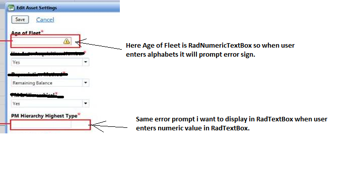 <script type="text/javascript"> function keyPress(sender, args) { var text = sender.get_value() + args.get_keyCharacter(); if (!text.match('^[0-9]+$'))//enter only numbers args.set_cancel(true); } function OnClientClick() { // show prompt like RadNumericTextBox var textbox = $find("<%= RadTextBox1.ClientID %>"); textbox._invalid = true; textbox.updateCssClass(); return false; }</script>Another suggestion is to use RadNumericTextBox which has all these functionalities implemented in itself. Check the following help documentation which explains more about this.
